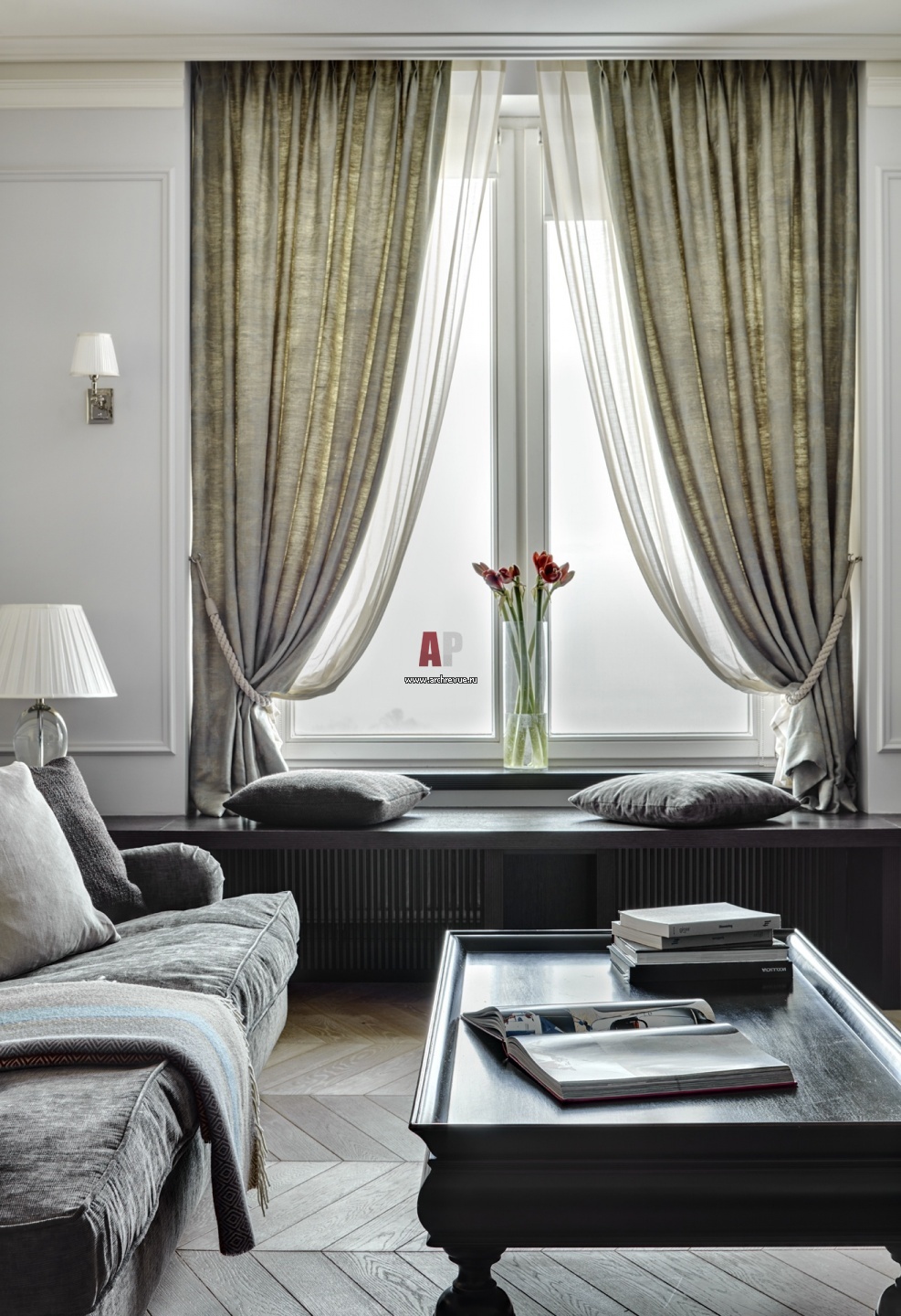 В гостиной и спальне спроектированы панорамные окна. Они оформлены широкими подоконниками-скамьями из темного дерева. Столярные изделия, на заказ, по эскизам дизайнеров, изготовление «Ассоциация русских мастеров».