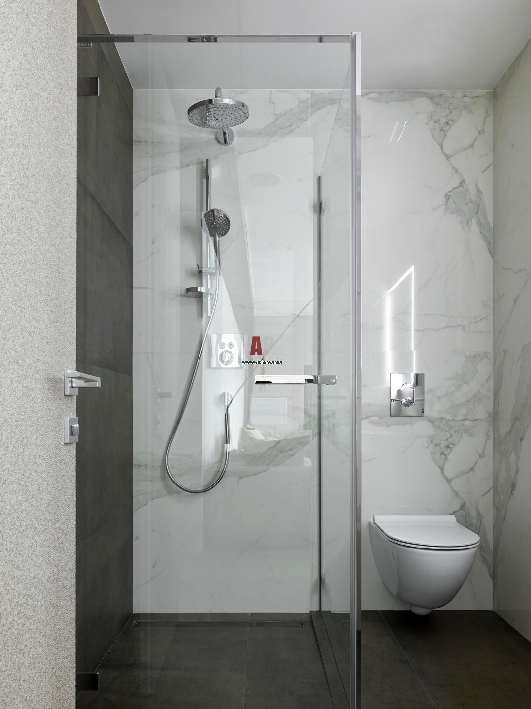 Душевая в гостевом санузле. Керамогранит, Calacatta.