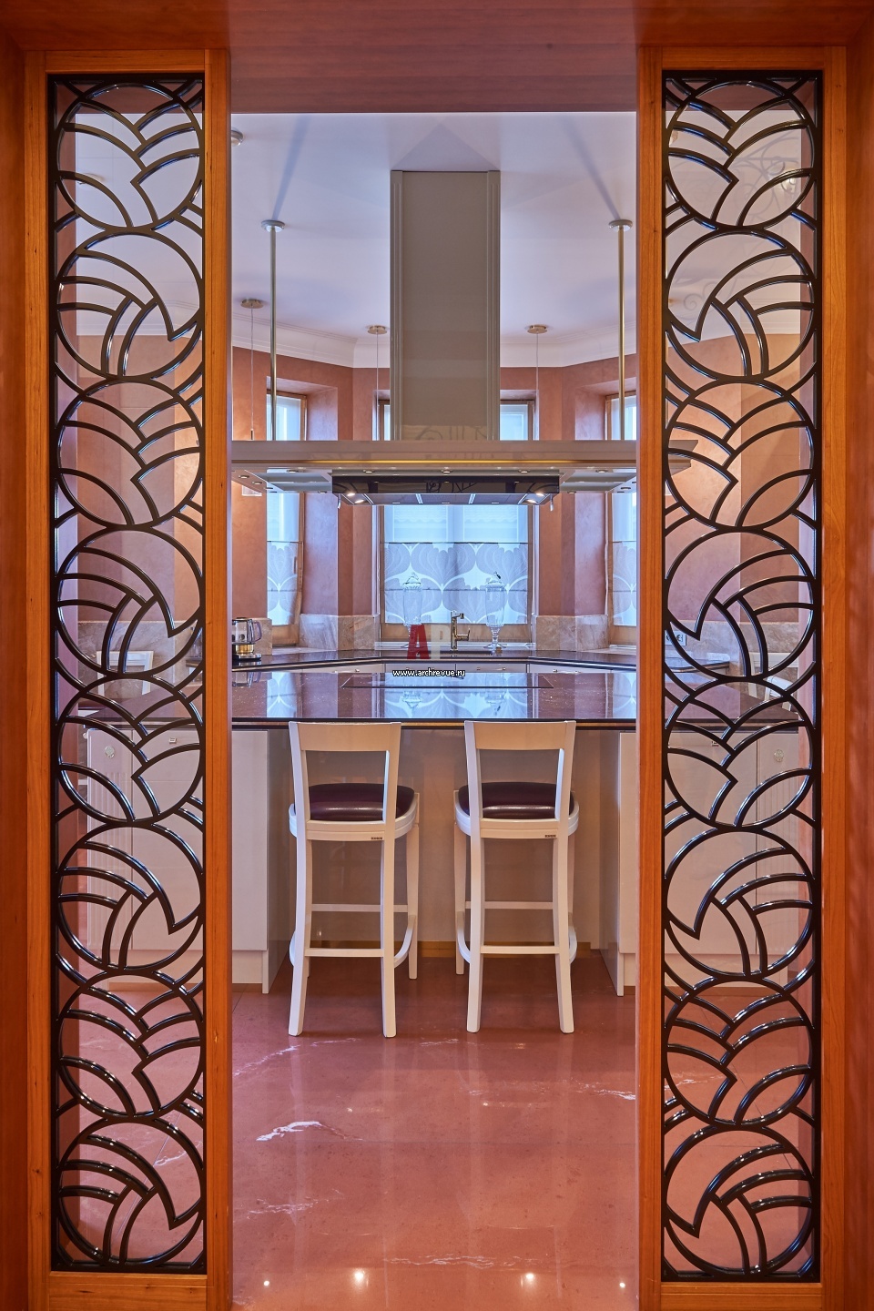 На одной оси с гостиной расположены кухня и столовая, оба помещения отделены перегородками из стекла и тонкого орнамента из черного лакированного дерева.