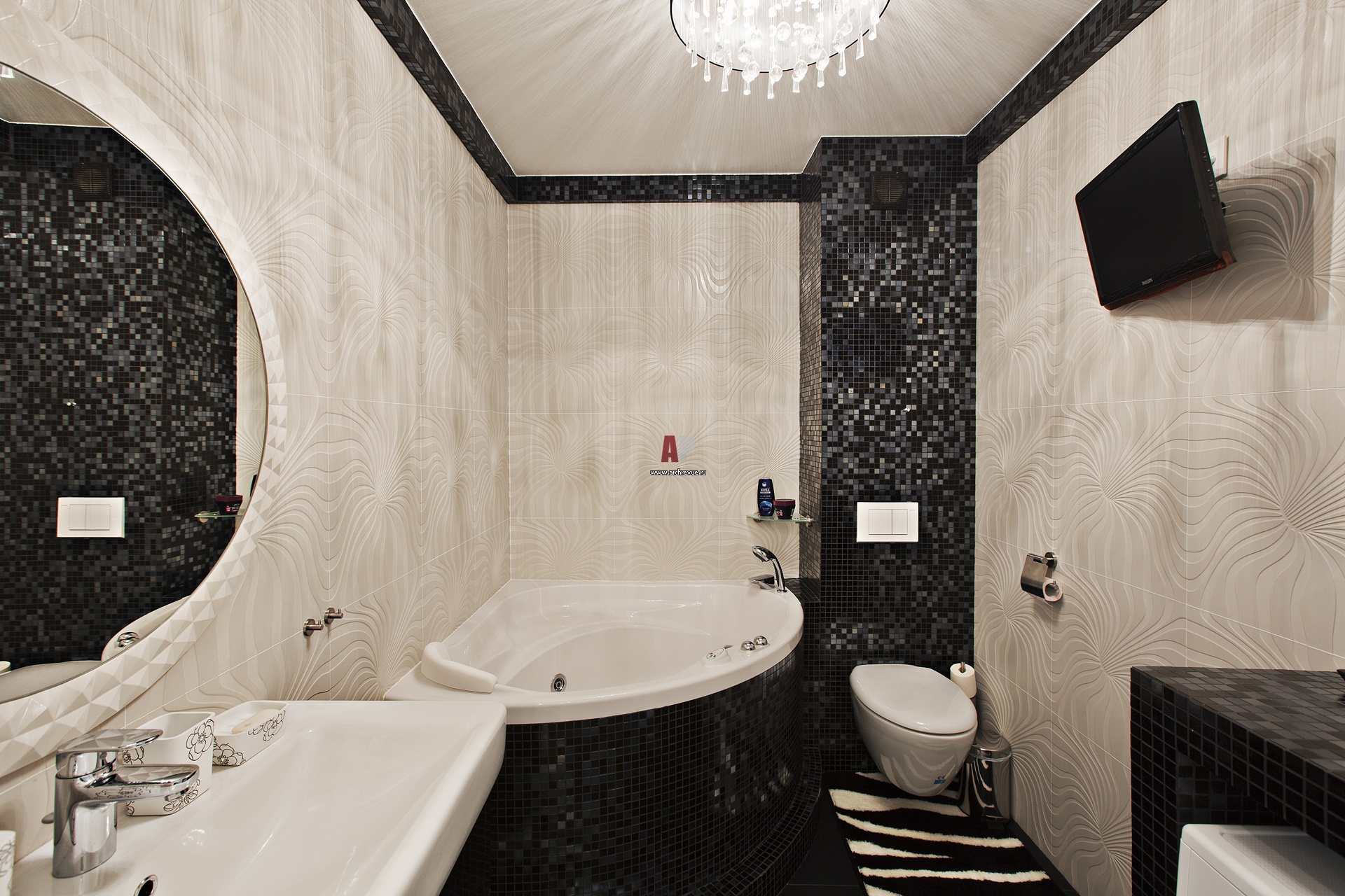 Ванная в черно-белом цвете. На стенах – керамическая плитка Cerdomus с рельефным орнаментом. Угловая ванна облицована черной с перламутром мозаикой.