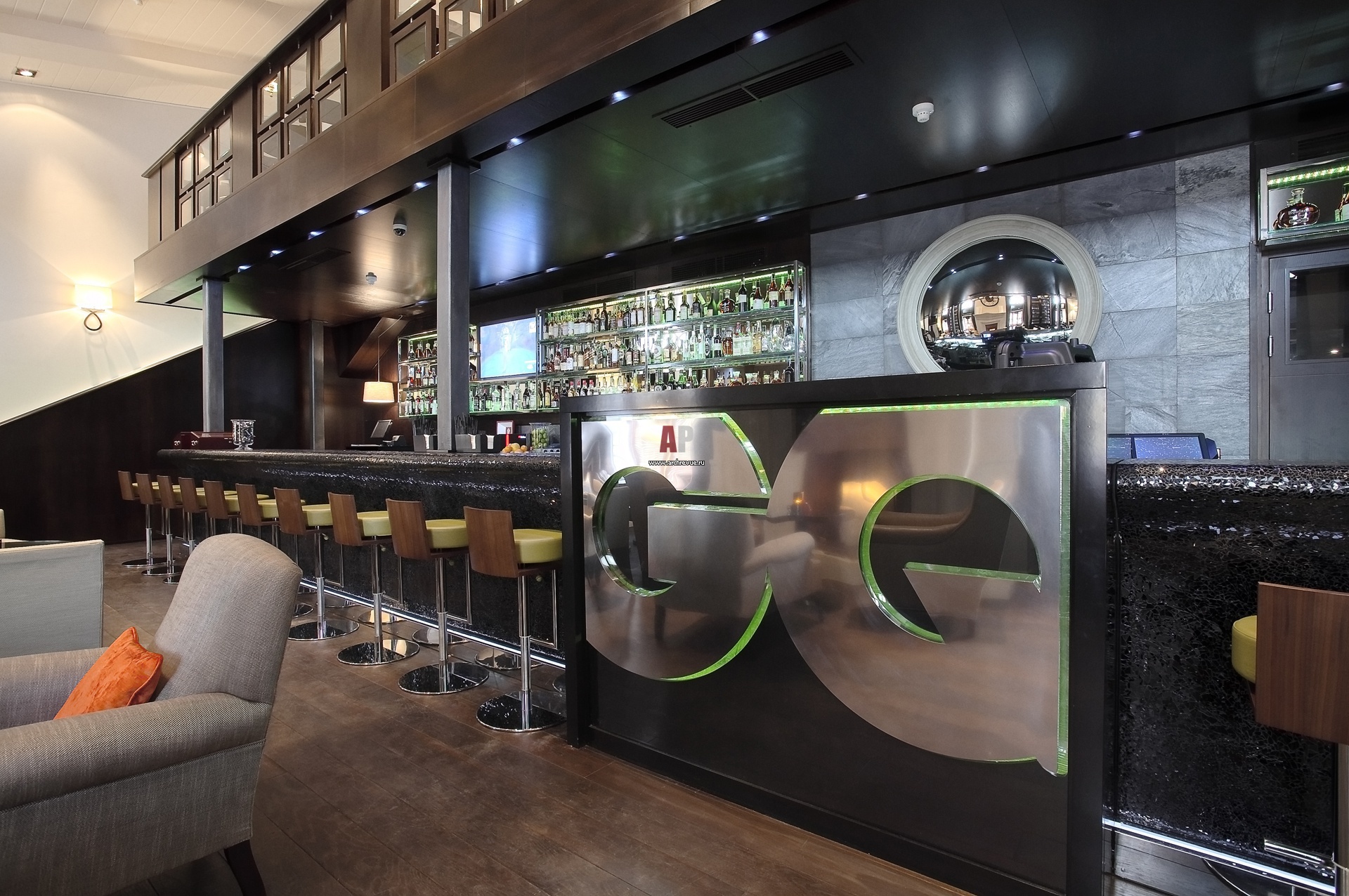 Акцент вытянутого помещения – длинная барная стойка обтекаемой формы. Она облицована антрацитовым битым стеклом и заказывалась в Китае. Стена за ней выложена серым сланцем, поставщик «Альпари СТК».