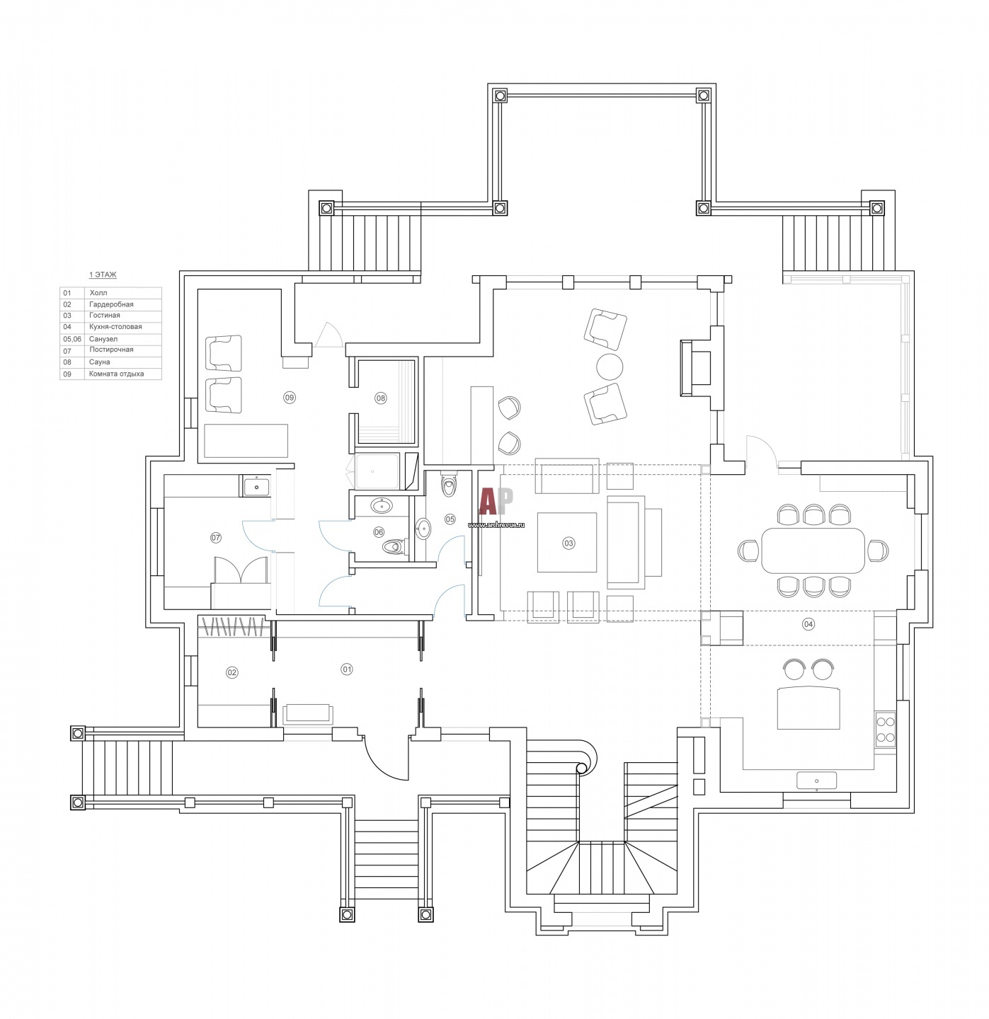 Планировка 1 этажа 3-х этажного дома с классической архитектурой.