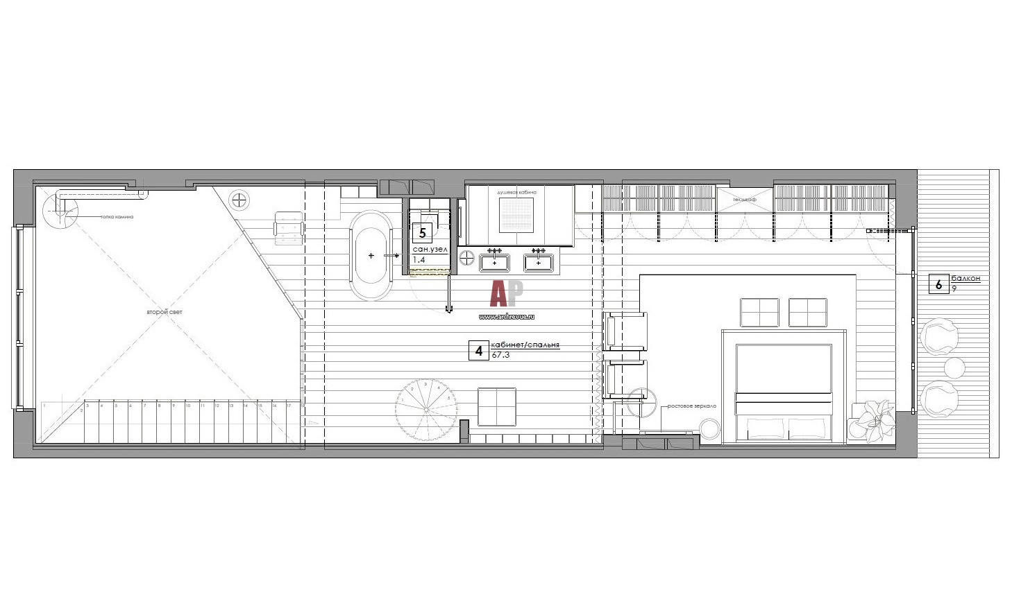 Планировка второго этажа многоэтажного лофта в комплексе апартаментов Manhattan House на Верхней Масловке.