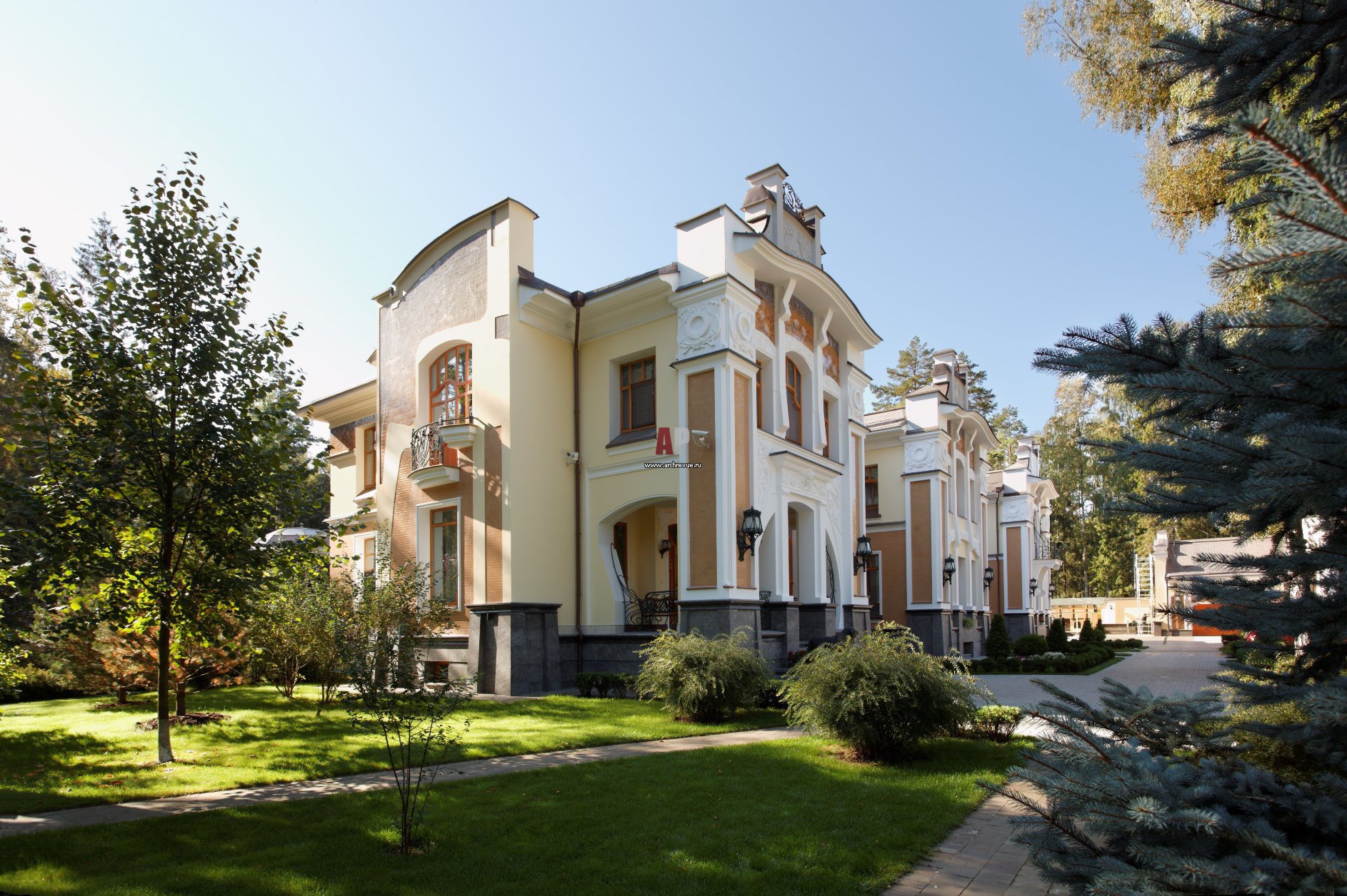 Фасад дома в стиле модерн, обращенный в парк. Ландшафт по эскизам архитекторов.