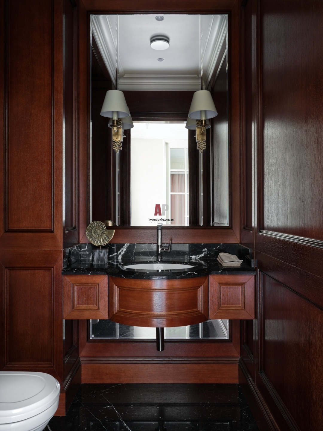 Гостевой санузел при входе в дом. Стены и мебель оформлены дубовым шпоном красного оттенка. На полу и столешнице – черный мрамор Nero Marquina. Раковина, Villeroy & Boch.