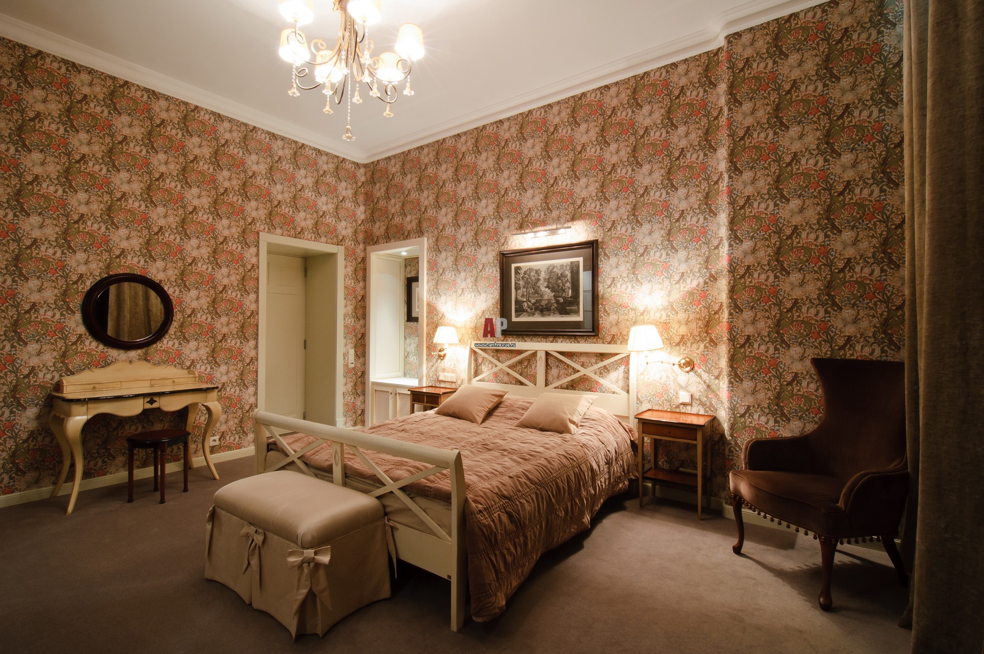 Спальня в стиле неоклассике. На стенах – английские бумажные обои со сложным орнаментом. Кровать во фламандском стиле.