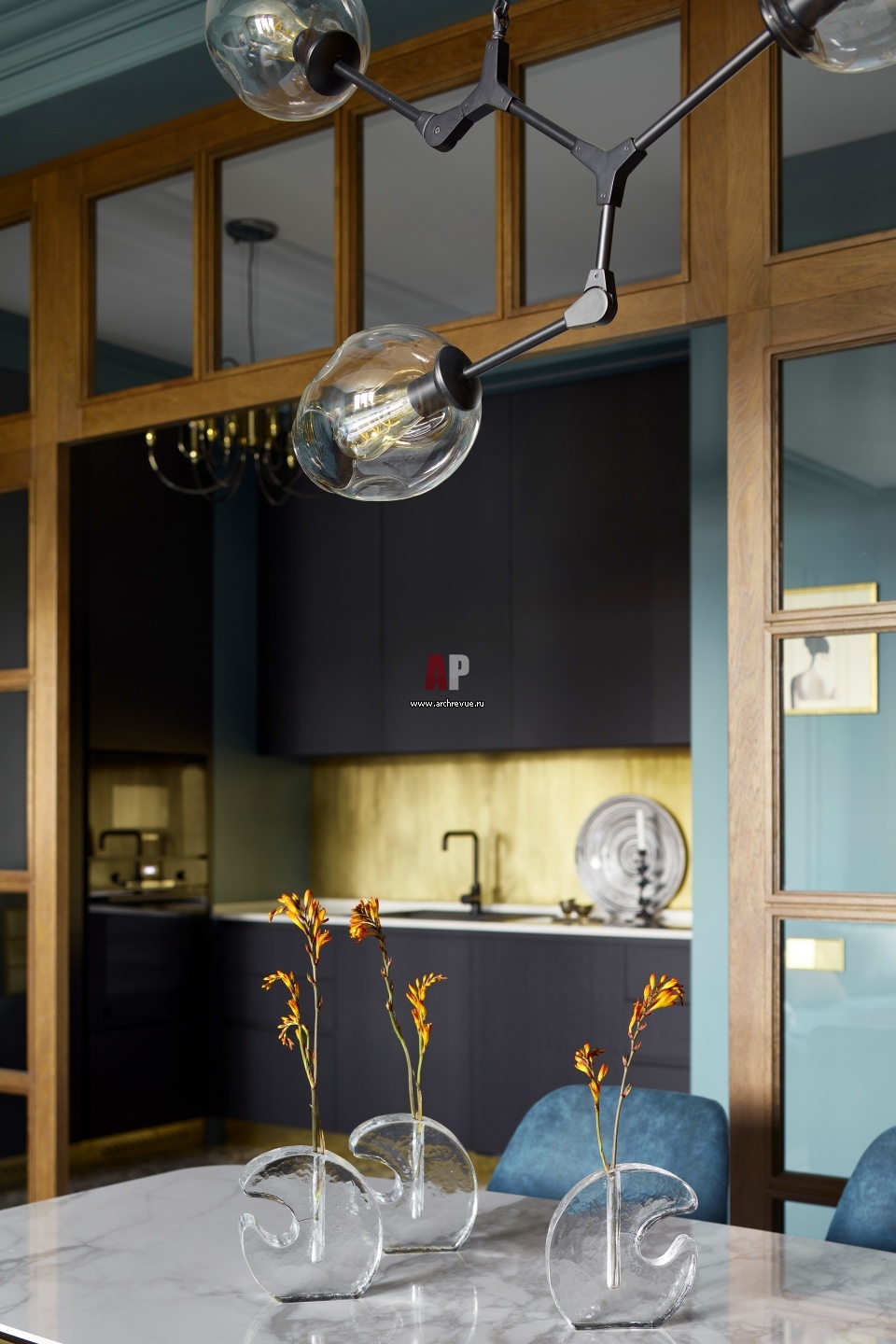 Между кухней и гостиной установлена прозрачная перегородка из стекла и дерева с открытым широким порталом. Вазы, винтаж.