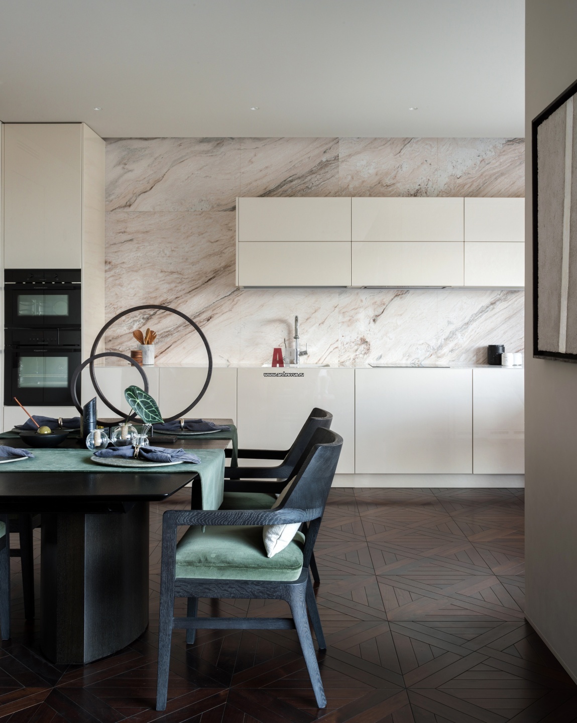 Интерьер кухни в монохромной гамме. Обеденный стол, Draenert. Стулья с зеленой обивкой, Christian Liaigre.