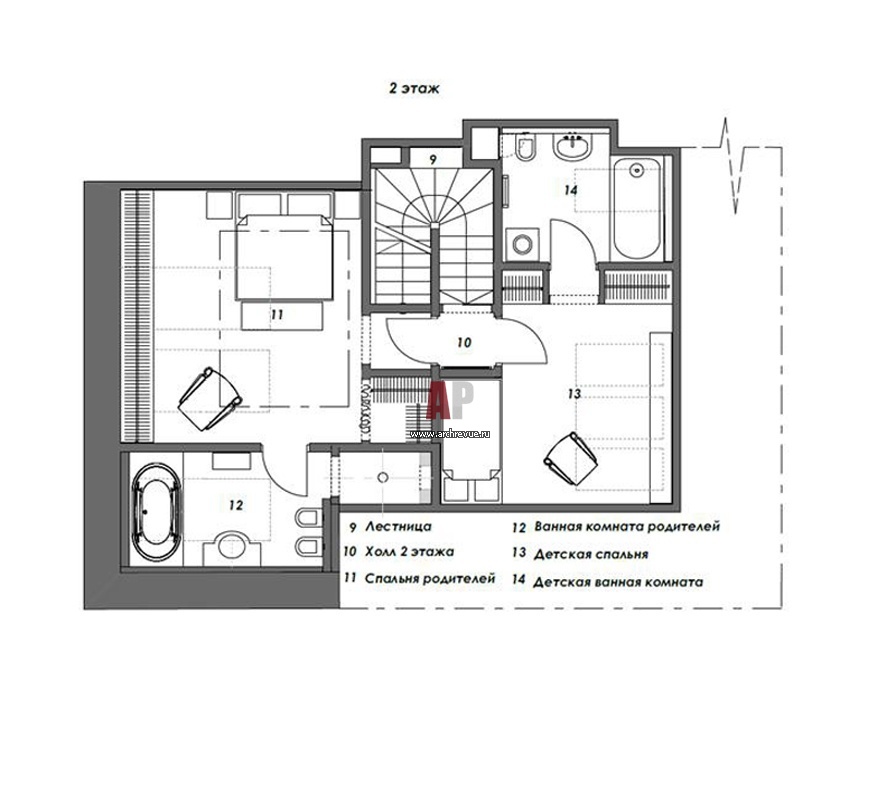 План второго этажа двухэтажной квартиры с мансардой на Патриарших прудах. Общая площадь - 154 кв. м.