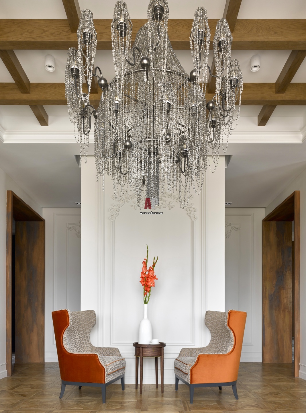 Зона отдыха в гостиной с оранжевыми креслами. Простенок украшен лепным декором и имитирует классические буазери.