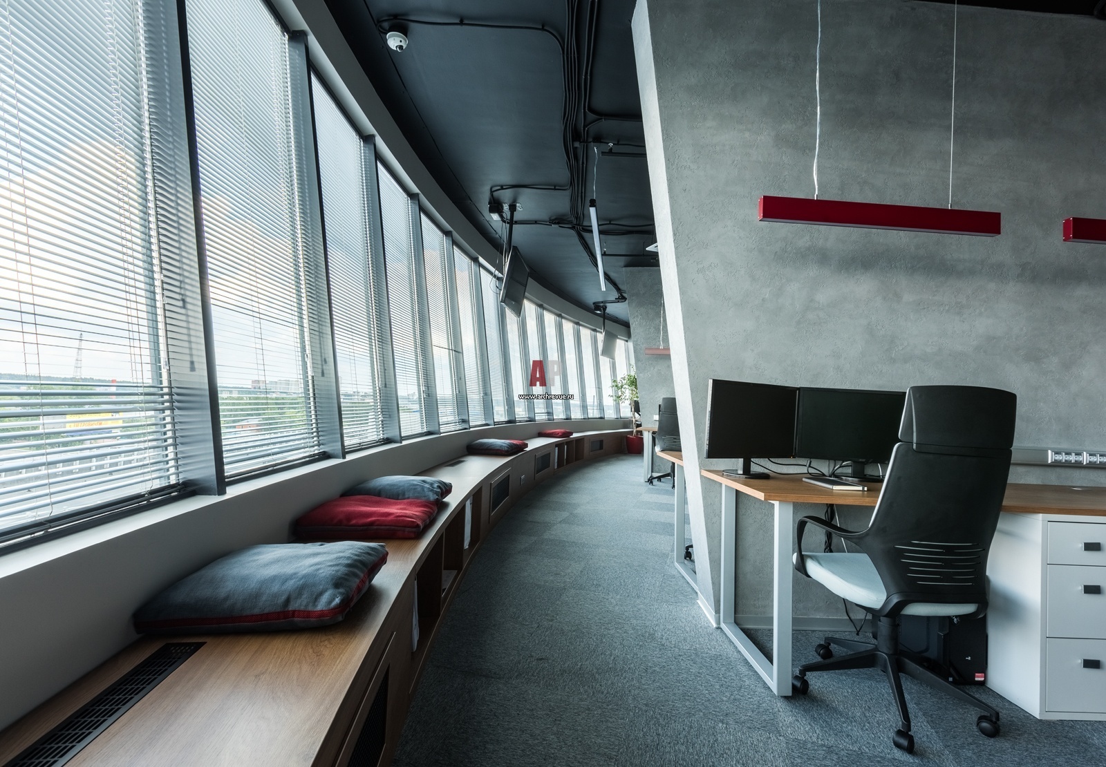 Особенность пространства – радиаторы отопления, расположенные в 40 см от окна. Чтобы их интегрировать в пространство, дизайнер зашила подоконное пространство деревом и сделала своего рода лаундж-зону, место для неформального общения сотрудников. В деревянные экраны встроены не только радиаторы, но и скрытые системы хранения рабочей документации. Работы по дереву – компания Bionica Wood.