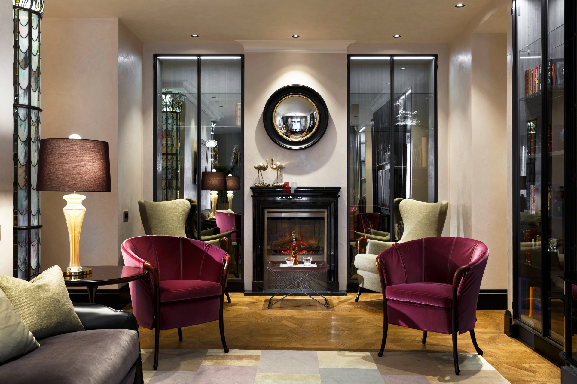 Зона камина в гостиной. Портал камина выполнен из черного полированного мрамора Nero Marquina. По обе стороны от него, в нишах – витрины Porro с зеркальными дверцами в кованых рамах. Кресла, Giorgetti. Настольные лампы, Barovier & Toso.