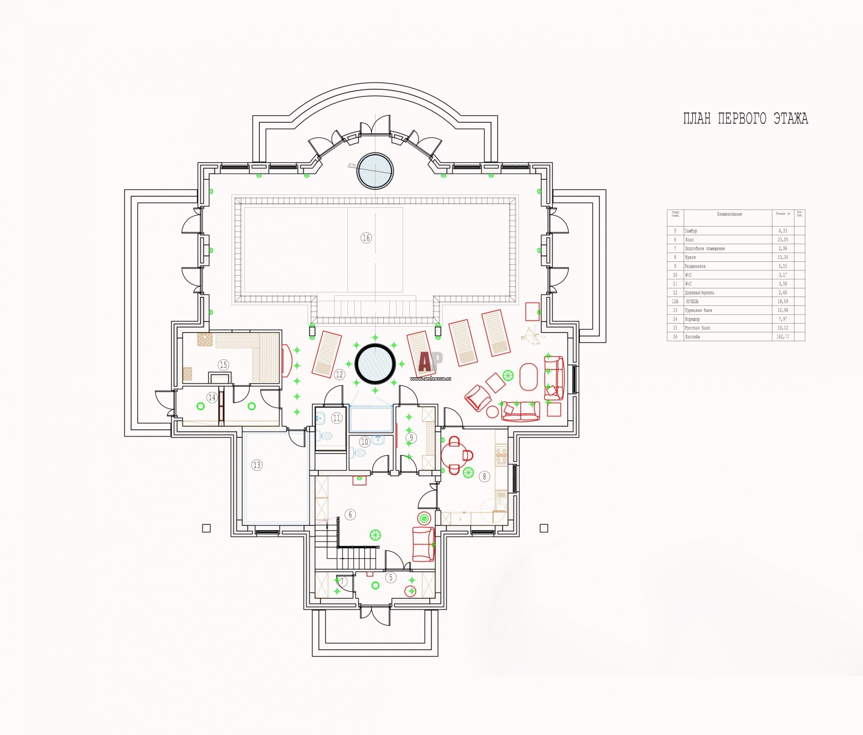 Планировка 1 этажа СПА-комплекса с бассейном.