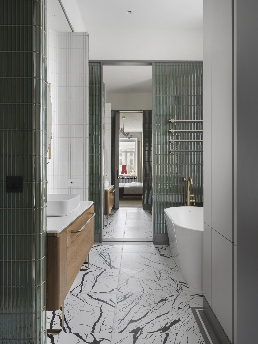 Хозяйская ванная комната. В оформлении использованы: насыщенного цвета рифленая плитка, скругленные плинтусы из камня, латунные вставки, очень высокие поворотные двери, камень на полу с эффектным графичным рисунком.