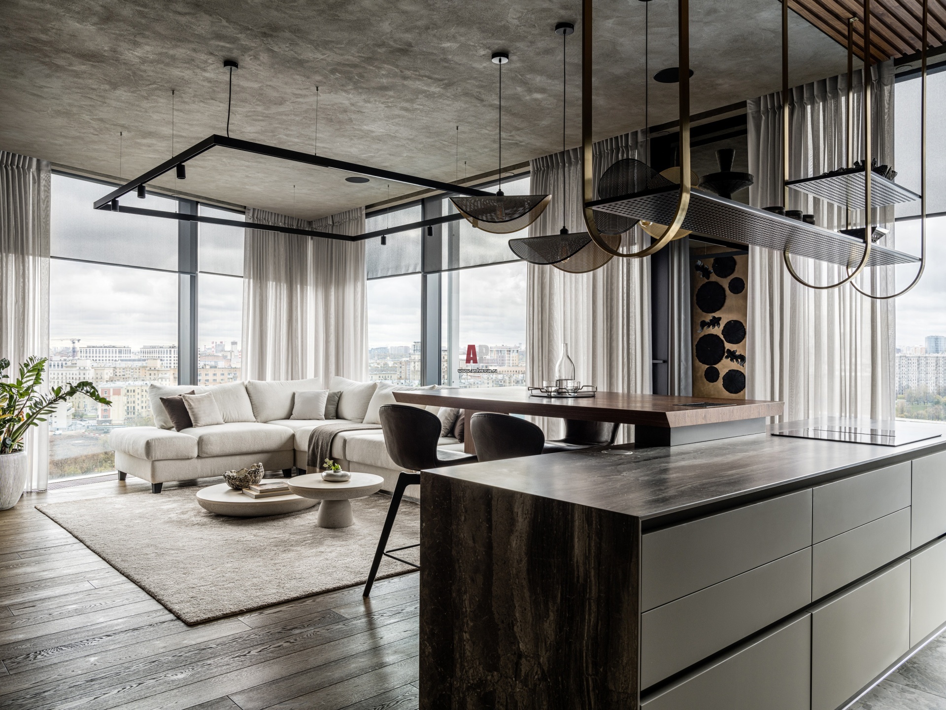 Мужская квартира в Москва-Сити. Интерьер кухни-гостиной выполнен в графитовых тонах. На стенах и потолке – микроцемент.
