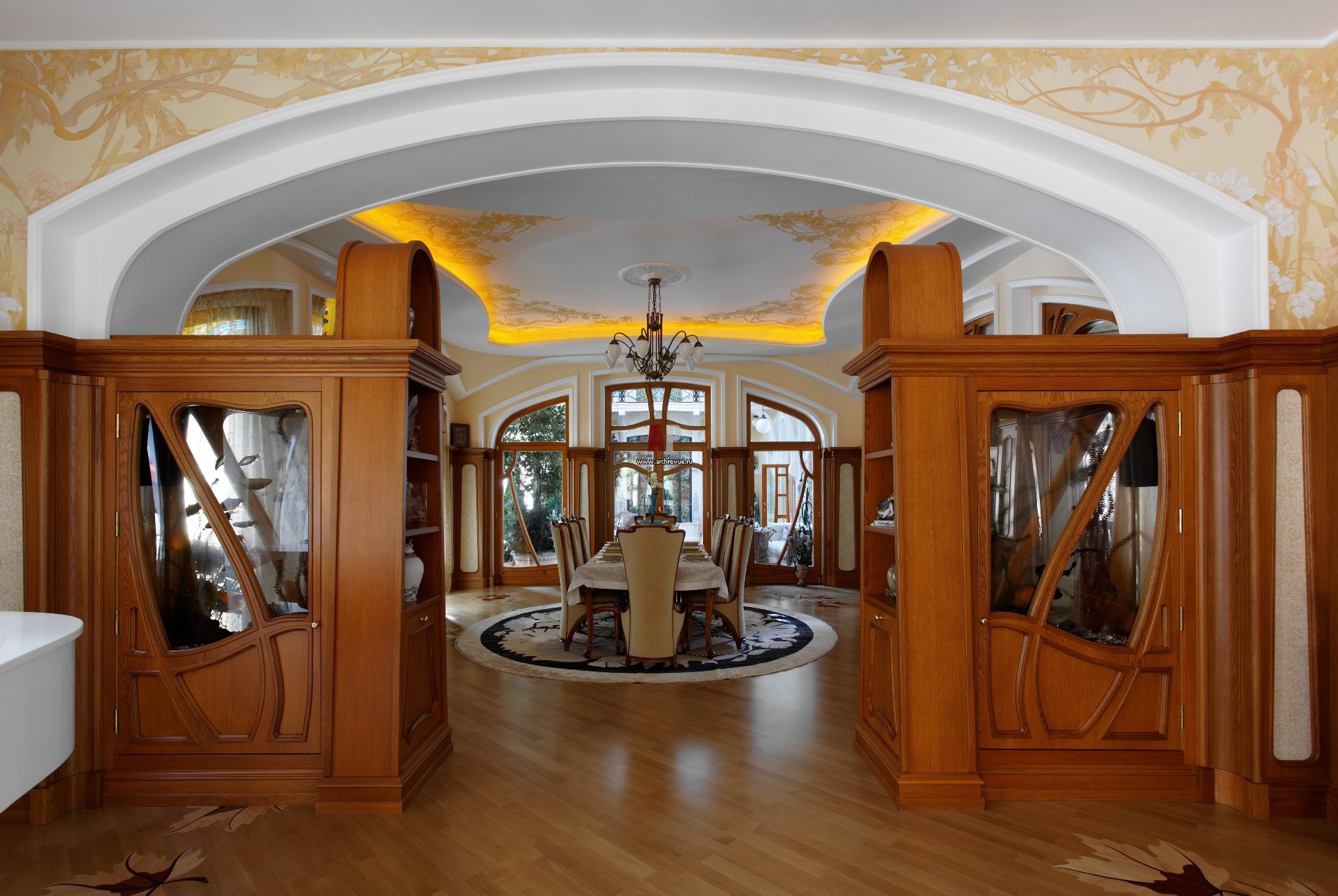 Виражные окна изготовлены по индивидуальному проекту. Из них открывается вид на зимний сад и бассейн.