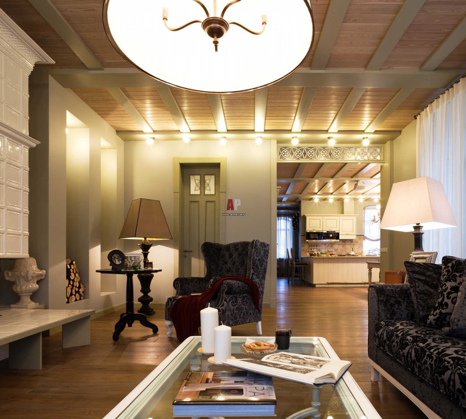 Потолки масштабированы балками и подшиты деревянной доской. Диван и кресло у камина, Veneta Sedie. Журнальный стол, Spini. Светильник с абажуром, Arizzi. Настольные лампы, Mis en Demeure.