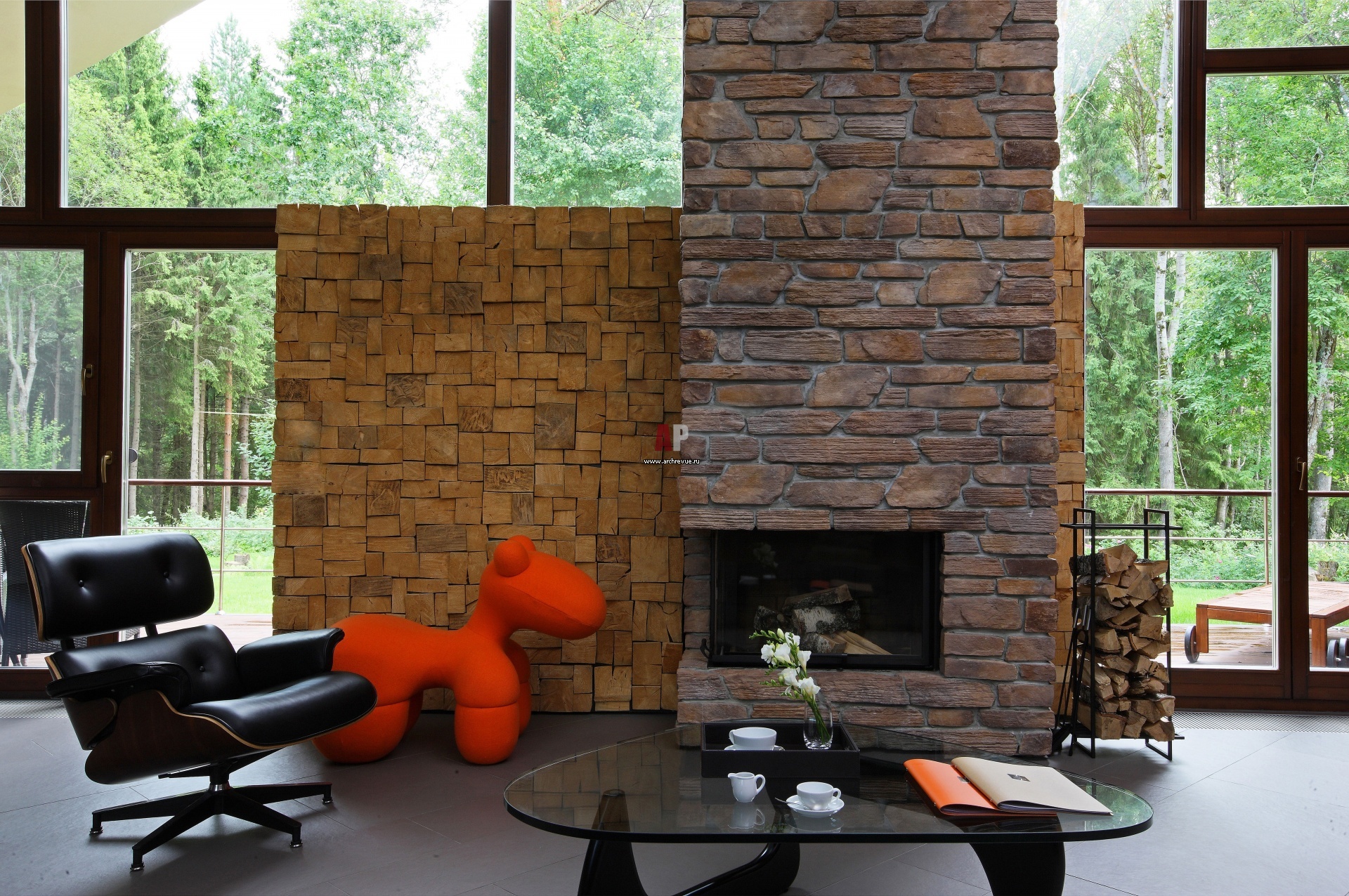 Бутик-отель «Родники». Гостиная одноэтажного номера. Камин облицован диким камнем. Декоративная поленница скрывает встроенный телевизор.
