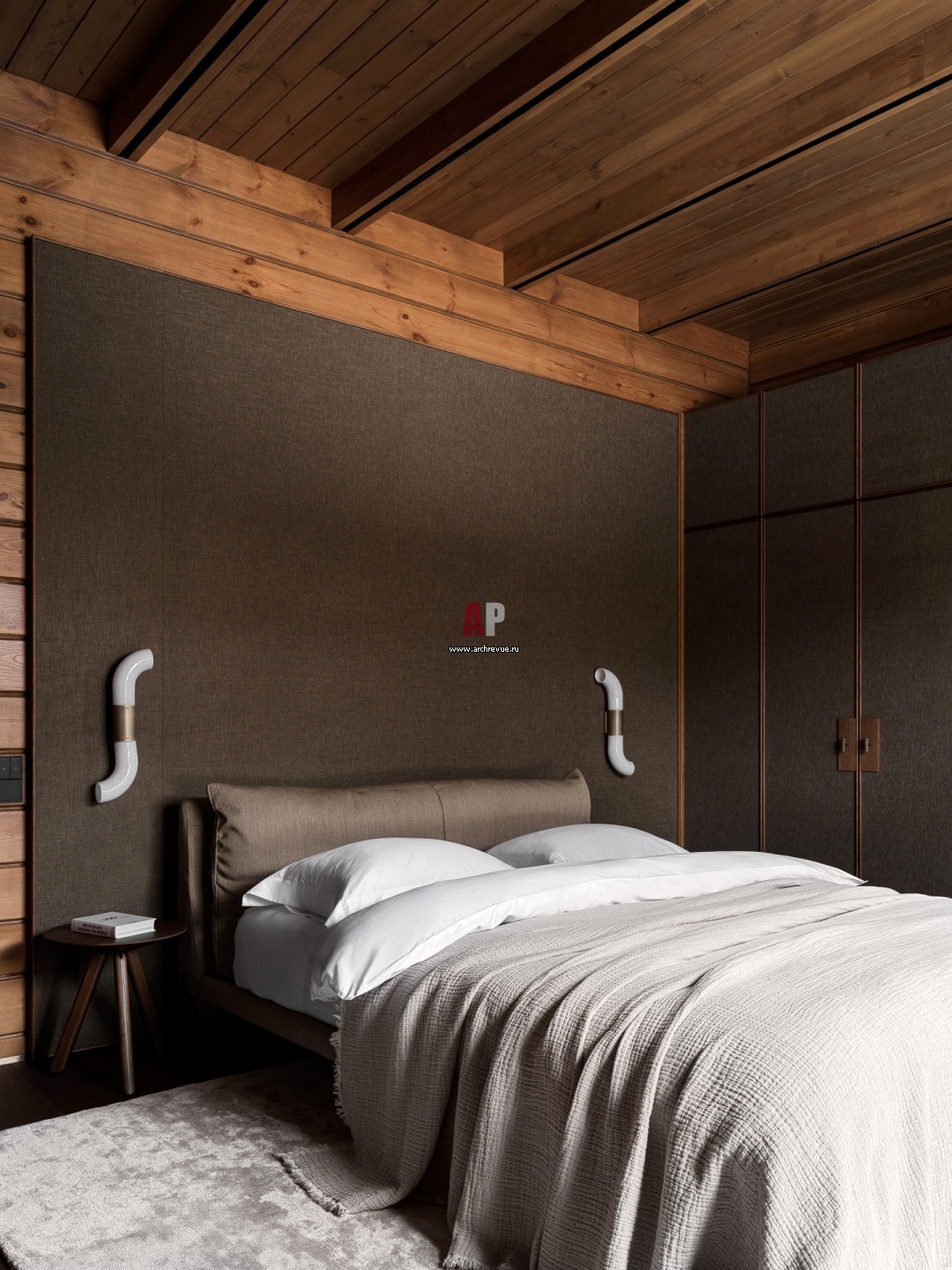Гостевая. За изголовьем кровати и на фасадах шкафа использованы обои с фактурой необработанного льна. Рамки выполнены из массива. Ручки изготавливались индивидуально в коже, выбранной в тон обоев.