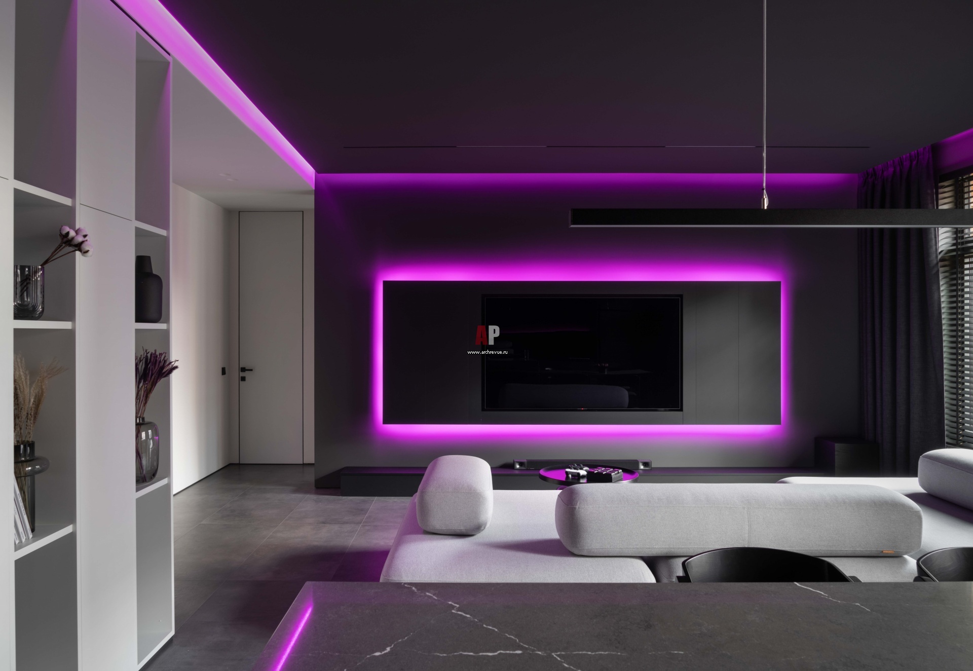 Зону ТВ обрамляет светодиодная подсветка. Вся подсветка контролируется с телефона, и можно задать единый оттенок во всех помещениях и мебели.