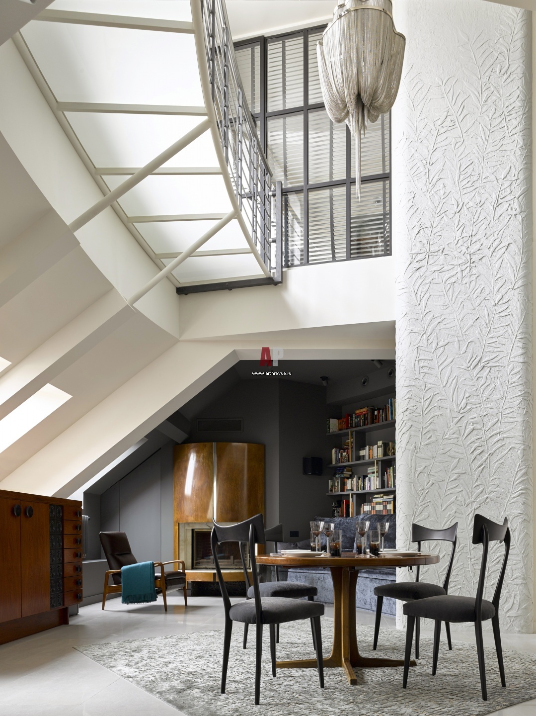 Трехэтажный пентхаус с элементами минимализма и ретро. Интерьер двухсветной гостиной-столовой. Диван, заказ, изготовление Moscow Room. Стеллаж с латунными элементами, на заказ, изготовление «Ассоциация русских мастеров». Буфет, винтаж, Moscow Room.