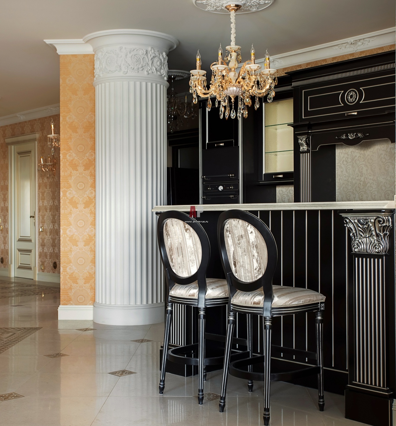 Кухонный блок с барной стойкой встроен в нишу выделен контрастным черным цветом. Кухонный гарнитур в классическом стиле, Tomassi Cucine (модель Solaria Laccato Nero).