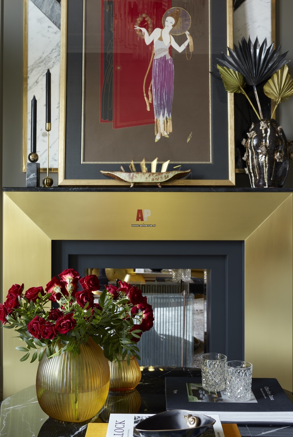 Квартира оформлена в насыщенной цветовой палитре. В ней много предметов декора и искусства. Портал камина выполнен из листовой латуни. На каминной полке - работа Эрте, New Year Eve.