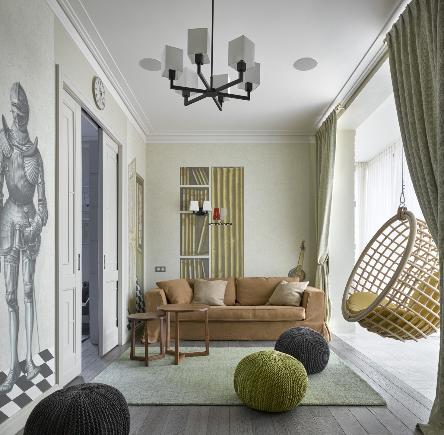 Детская-игровая, когда младшие сыновья подрастут, она превратится в отдельную спальню. Обои с рыцарями, Fornasetti. Светильник, Stephane Davidts. Подвесное кресло из ротанга, Ferlea, модель Kata. Диван, Meridiani, модель Guinness. Столики, Flexform, модель Jiff.