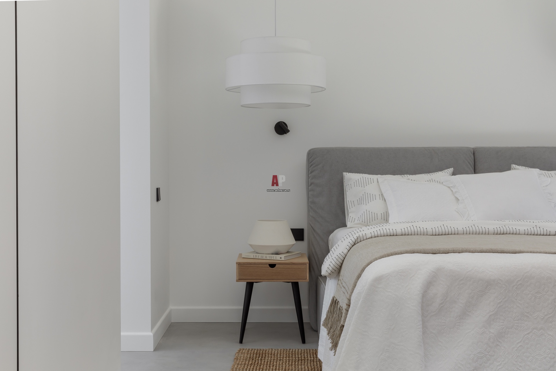 «Двойной» дом для большой семьи. Белая женская спальня. Полы во всем доме, включая спальни и санузлы, наливные. Бесшовное покрытие подчеркивает современную архитектуру и чистоту пространства.