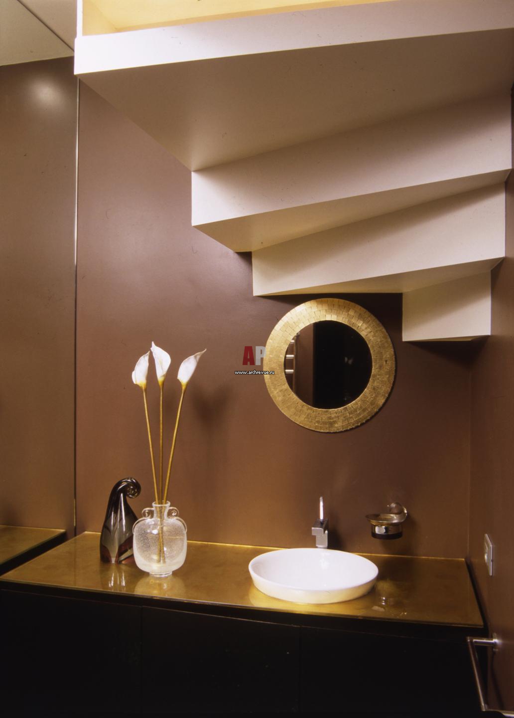 Изначально авторы планировали сделать в небольшом помещении второго уровня гардеробную, но затем решили разместить домашний кинотеатр. Лестницу, ведущую наверх, вписали в пространство гостевого санузла. Она выглядит своего рода скульптурой в интерьере.
