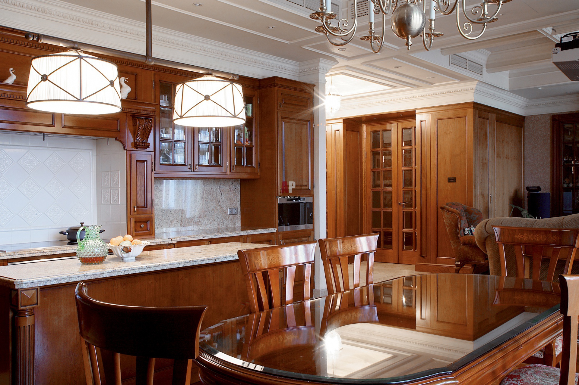 Фото кухни в деревянном исполнении. С темным деревом контрастирует светлый фартук и камень столешниц. Подвесная конструкция для двух текстильных абажуров над рабочим островом сделана по чертежам архитекторов.