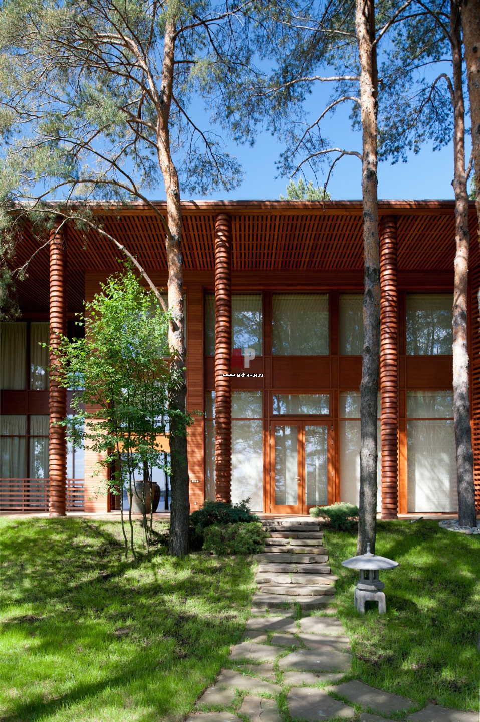 Фасад обрамлен рядом рустованных колонн из дерева. Они рифмуются с деревьями на участке. Заполнение оконных проемов - деревянные оконные рамы с двойным стеклопакетом, витражи индивидуального изготовления.