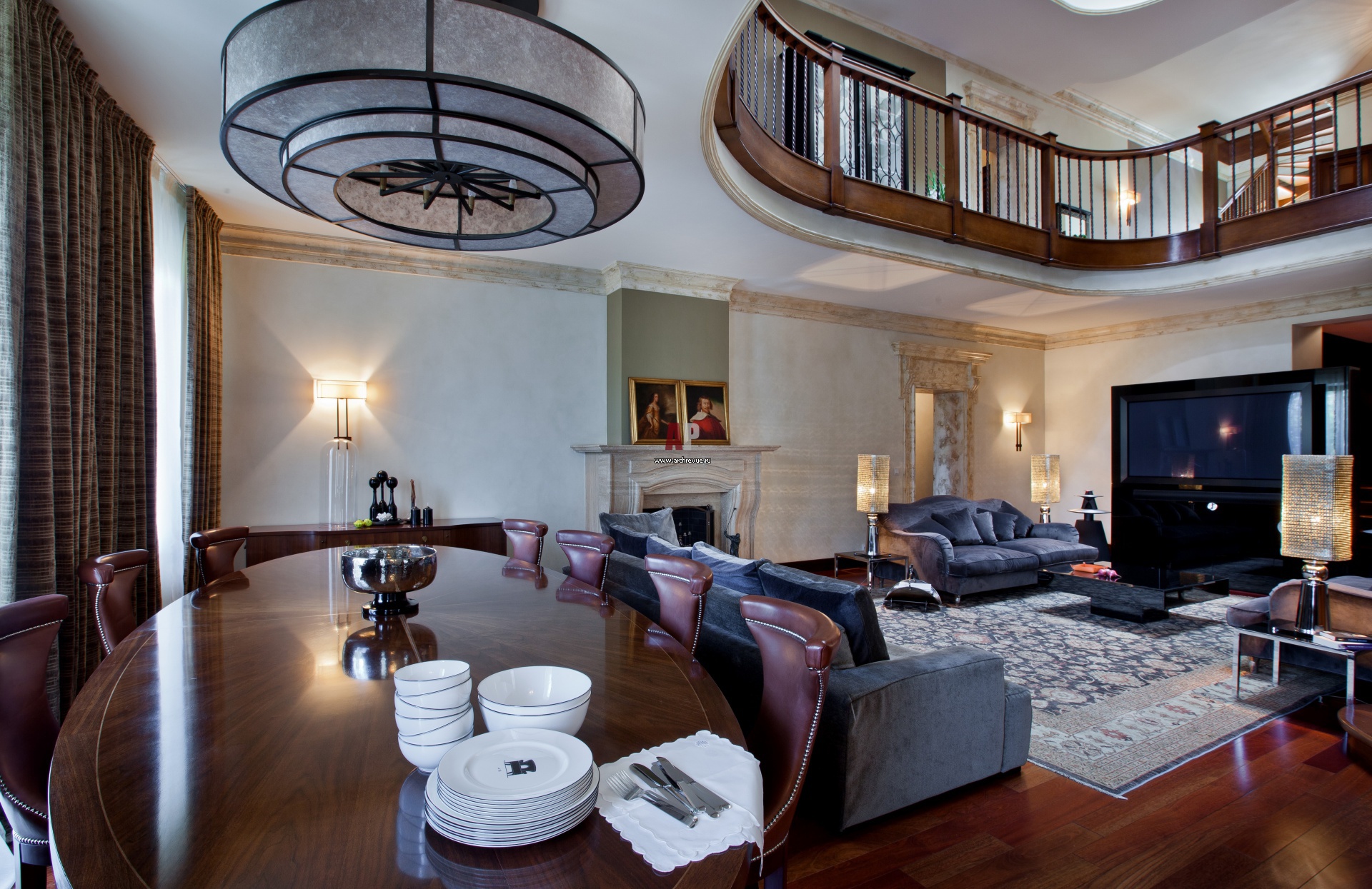 Фото дизайна парадной столовой в интерьере гостиной. Обеденный стол Henredon (by Barbara Barry), массивное дерево, под лаком, инкрустация в форме звезды. Кожаные стулья, Ralph Lauren.