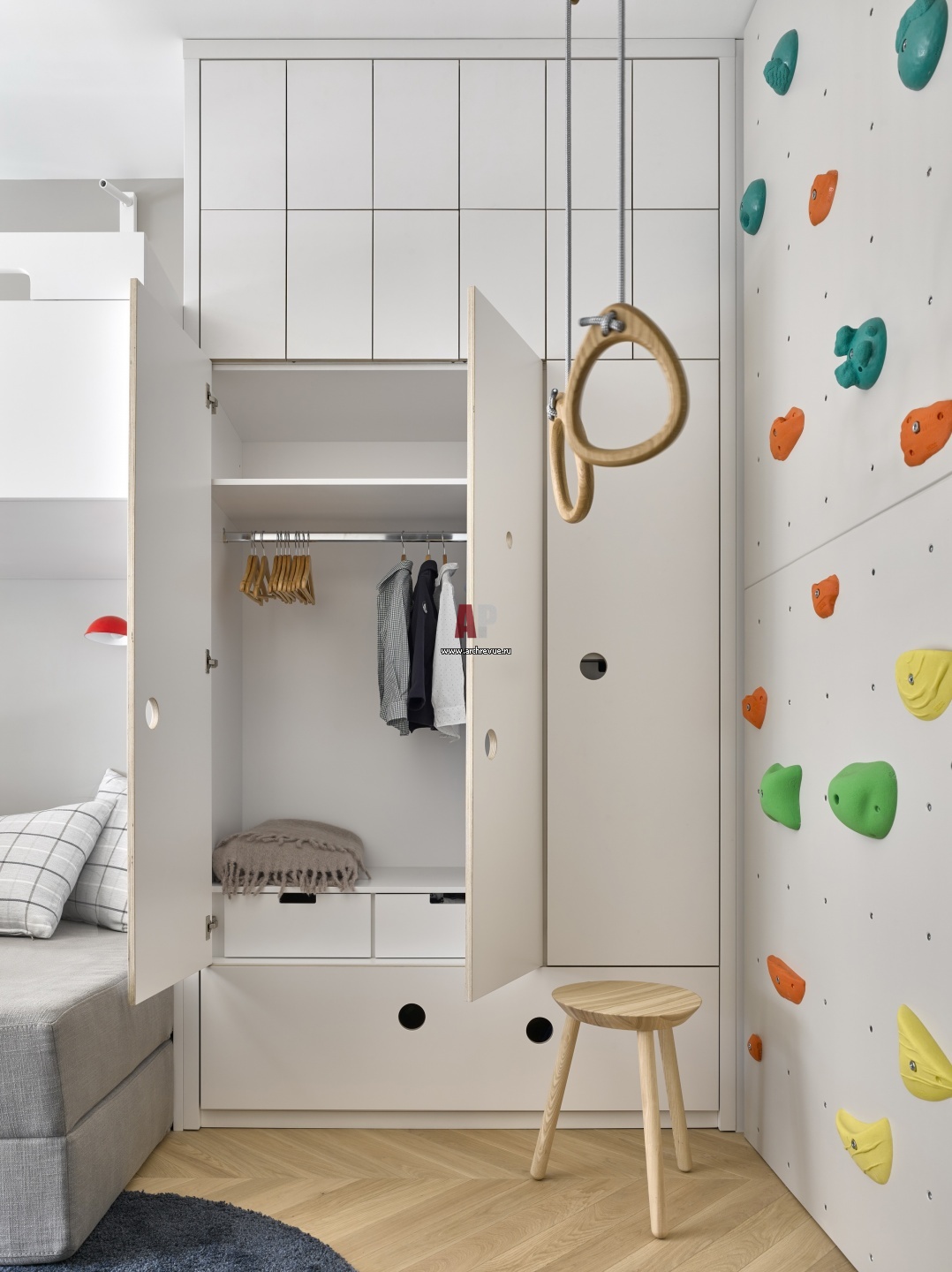Спортивная зона в детской. Помимо мини-скалодрома здесь есть спортивный комплекс с гимнастическими кольцами, а также встроенная система хранение для инвентаря.