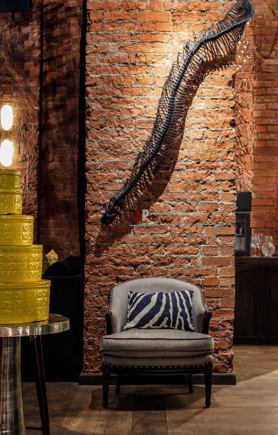 На винтажной кирпичной стене – скульптура в виде скелета змеи из литого чугуна. Ее постоянные посетители прозвали «Злой Фредди».