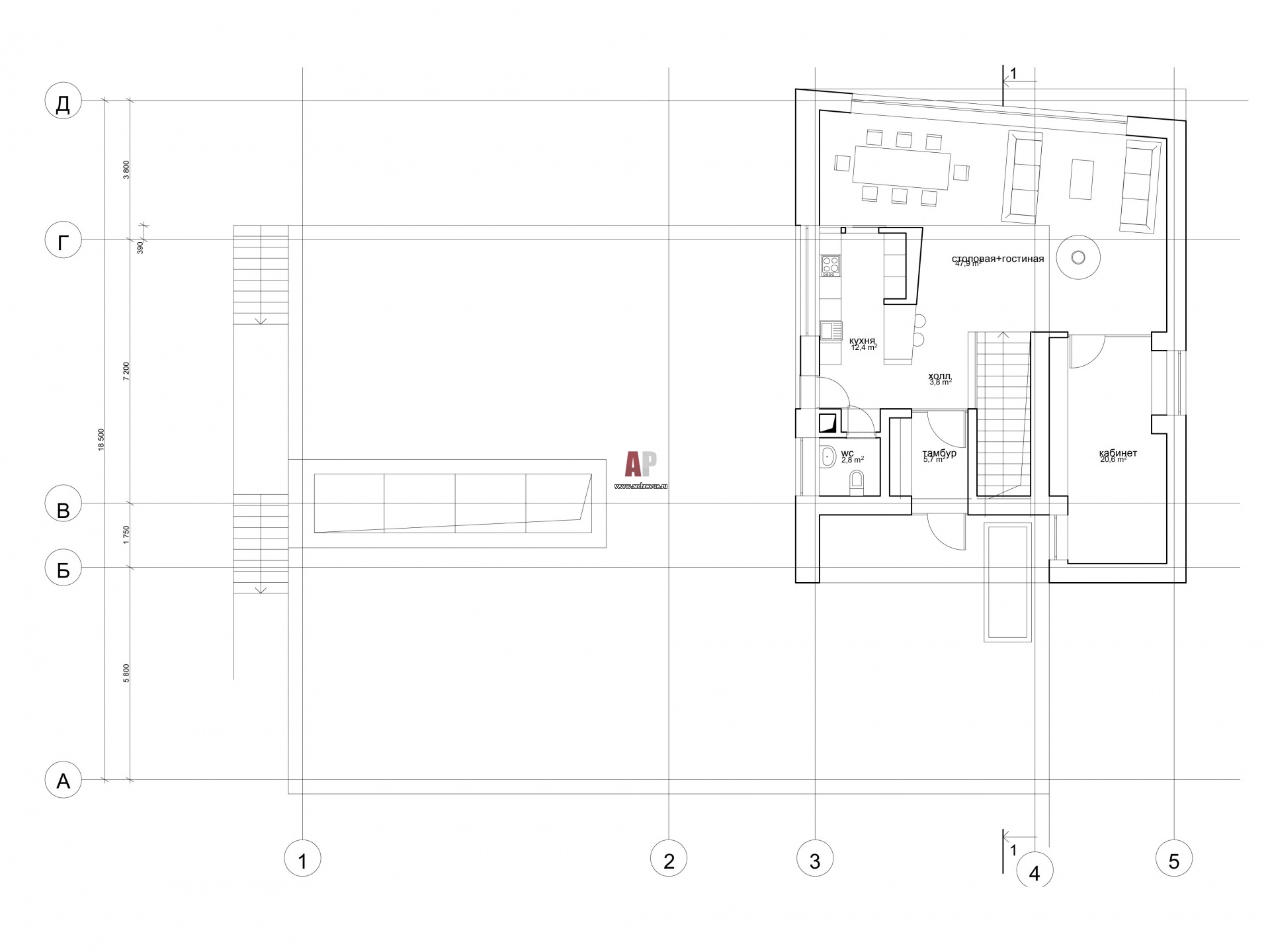 Планировка 2 этажа 2-х этажного дома. Общественный этаж расположен на верхнем уровне.