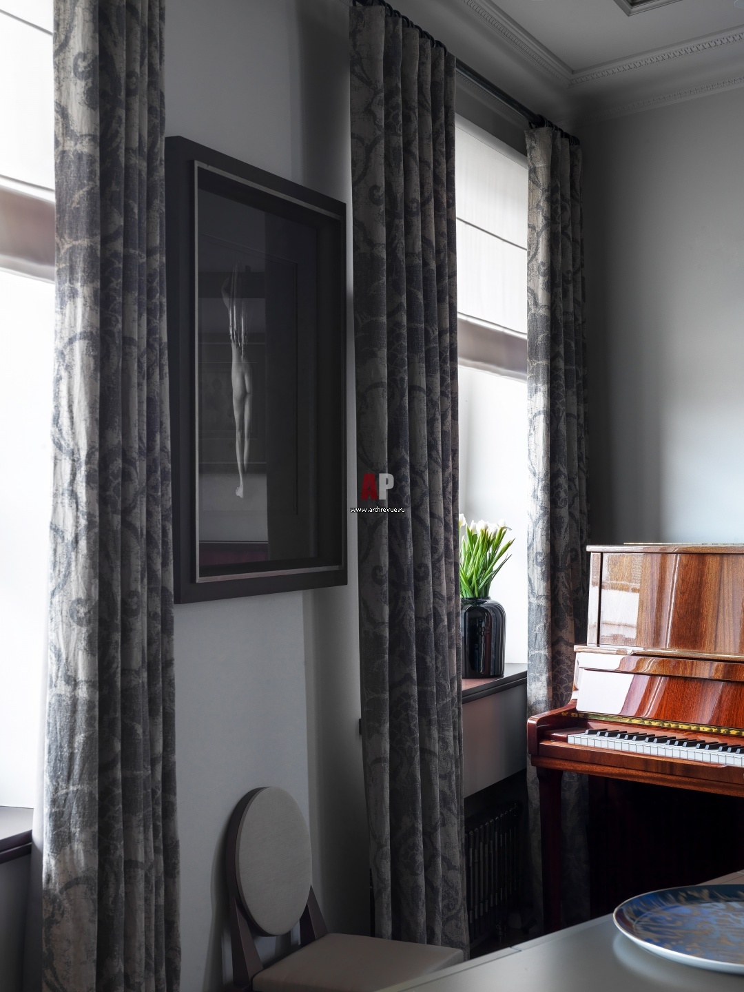 Интерьер гостиной в серо-серебристых тонах. Шторы из ткани, De Le Cuona. Cтул, Philippe Hurel.