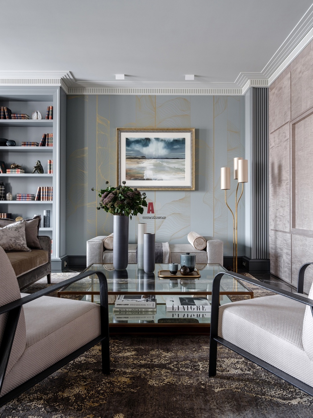 Квартира в серо-жемчужной палитре. Зона отдыха в гостиной. Обои ручной работы с деликатным свечением, Fresq. Кресла, Chai Ming Studios. Журнальный стол, Julian Chichester.