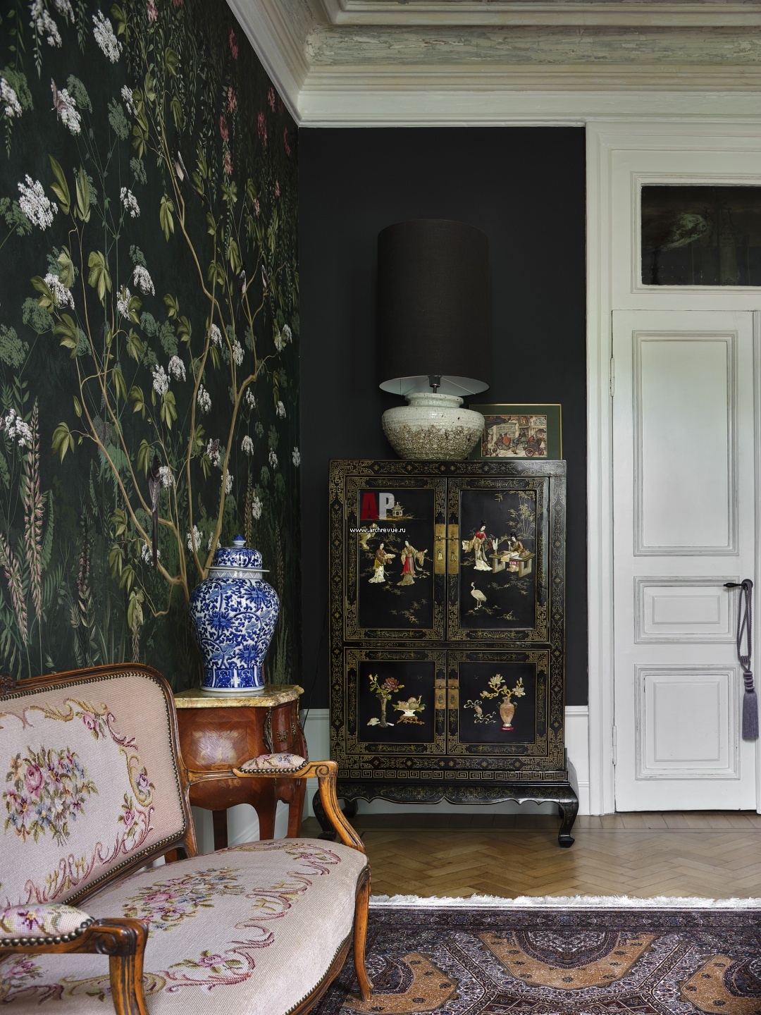 Второй акцент спальни – бесшовные обои Afresco сюжетом сумрачного леса, люпинами и сороками на ветвях деревьев. Мебель в стиле шинуазри, антиквариат.