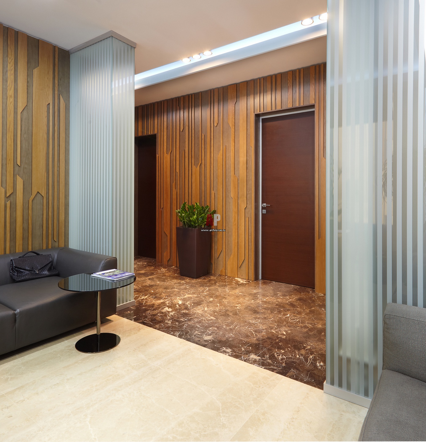 Фото дизайна приемной в офисе. Стены оформлены вертикальными деревянными панелями. Входная группа обозначена колоннами из прозрачного в матовую полоску стекла.