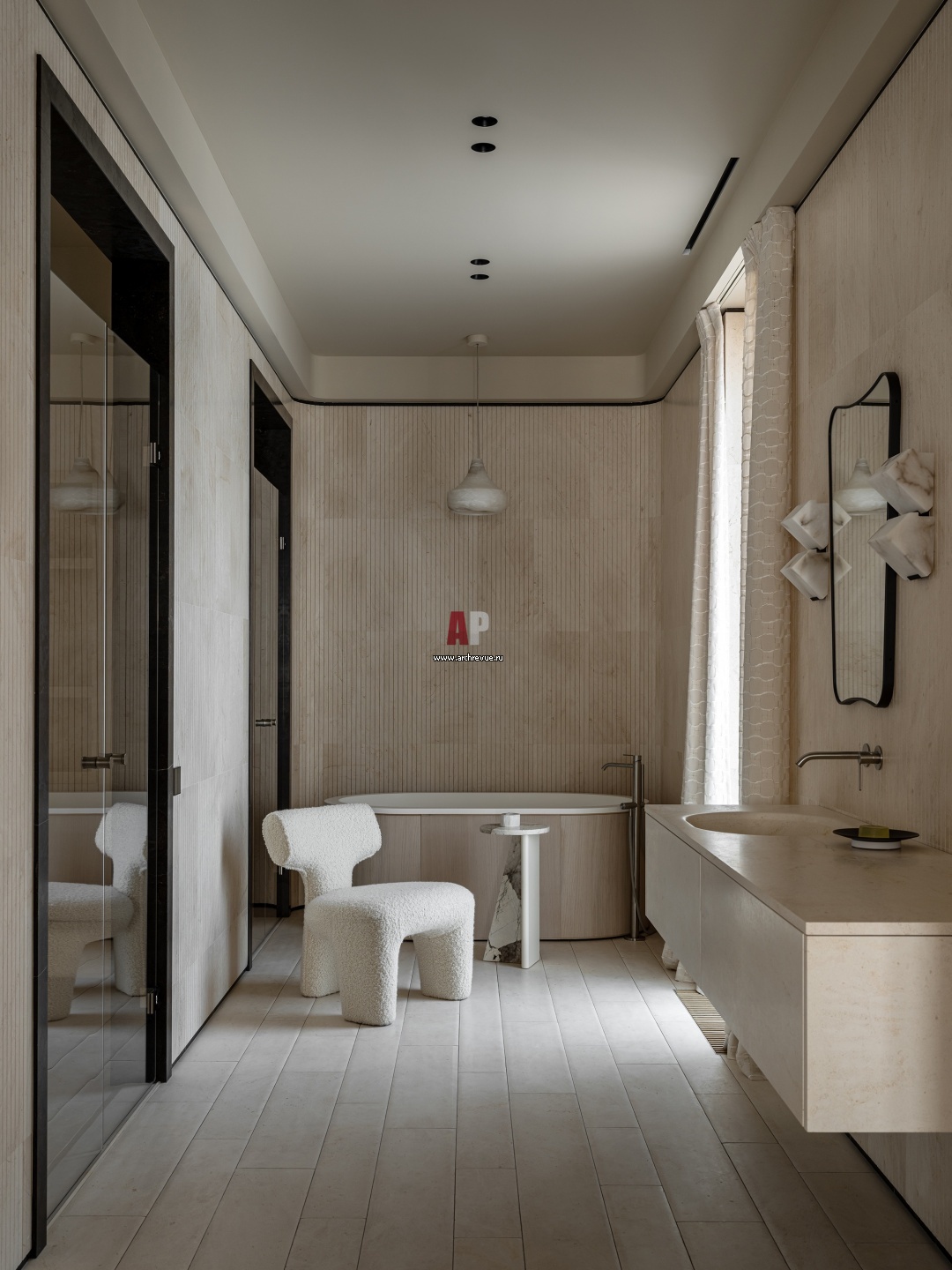 По оси входа в ванную расположена ванна в отделке шпоном дуба. Рядом небольшое кресло, Pierre Frey и авторский столик. Над ванной светильник из алебастра, Atelier Alain Ellouz, модель Zelie. Он дает мягкий и приятный свет.