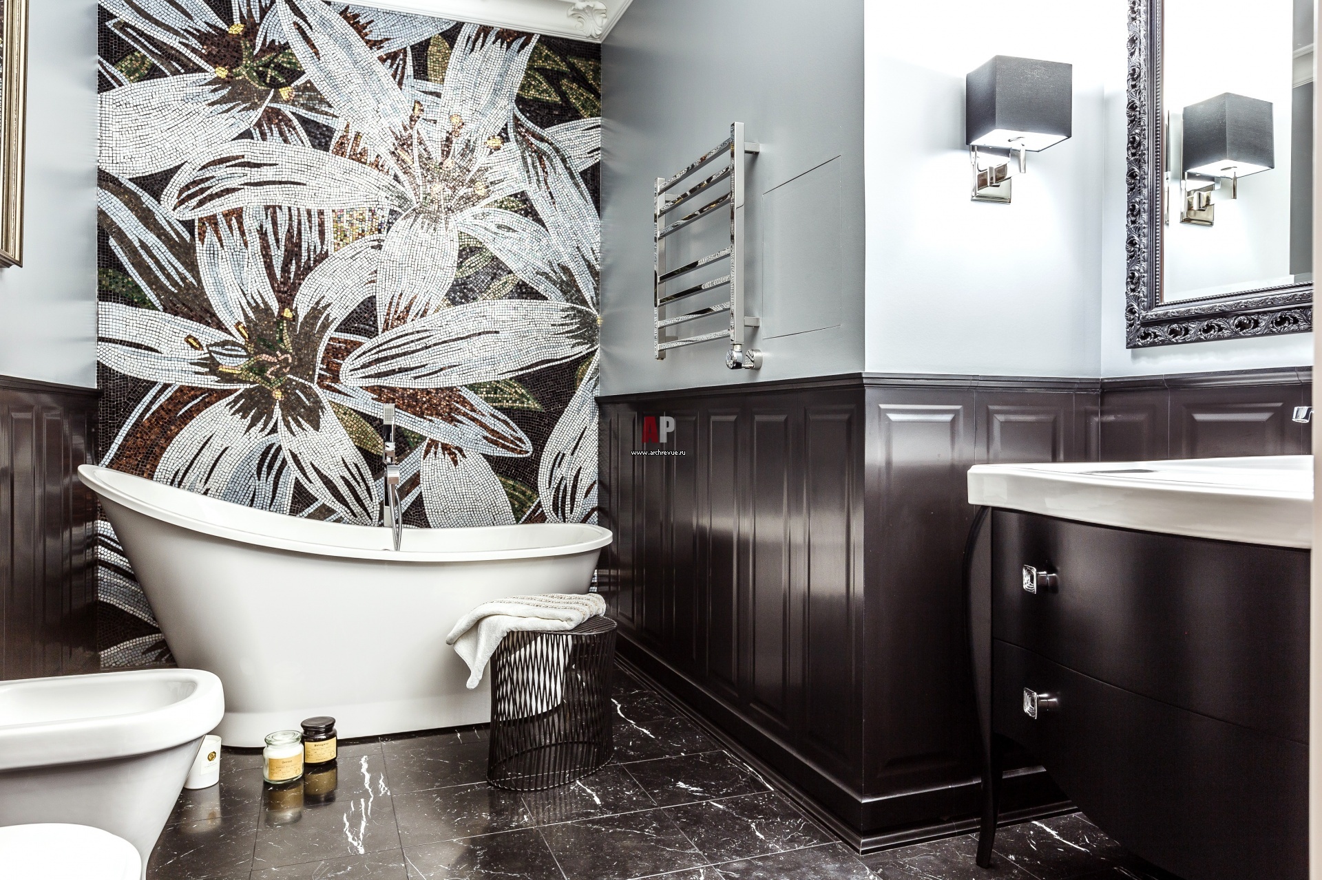 Хозяйская ванная комната украшена роскошным мозаичным панно с лилиями. На полу и стенах – мрамор Nero Marquina .