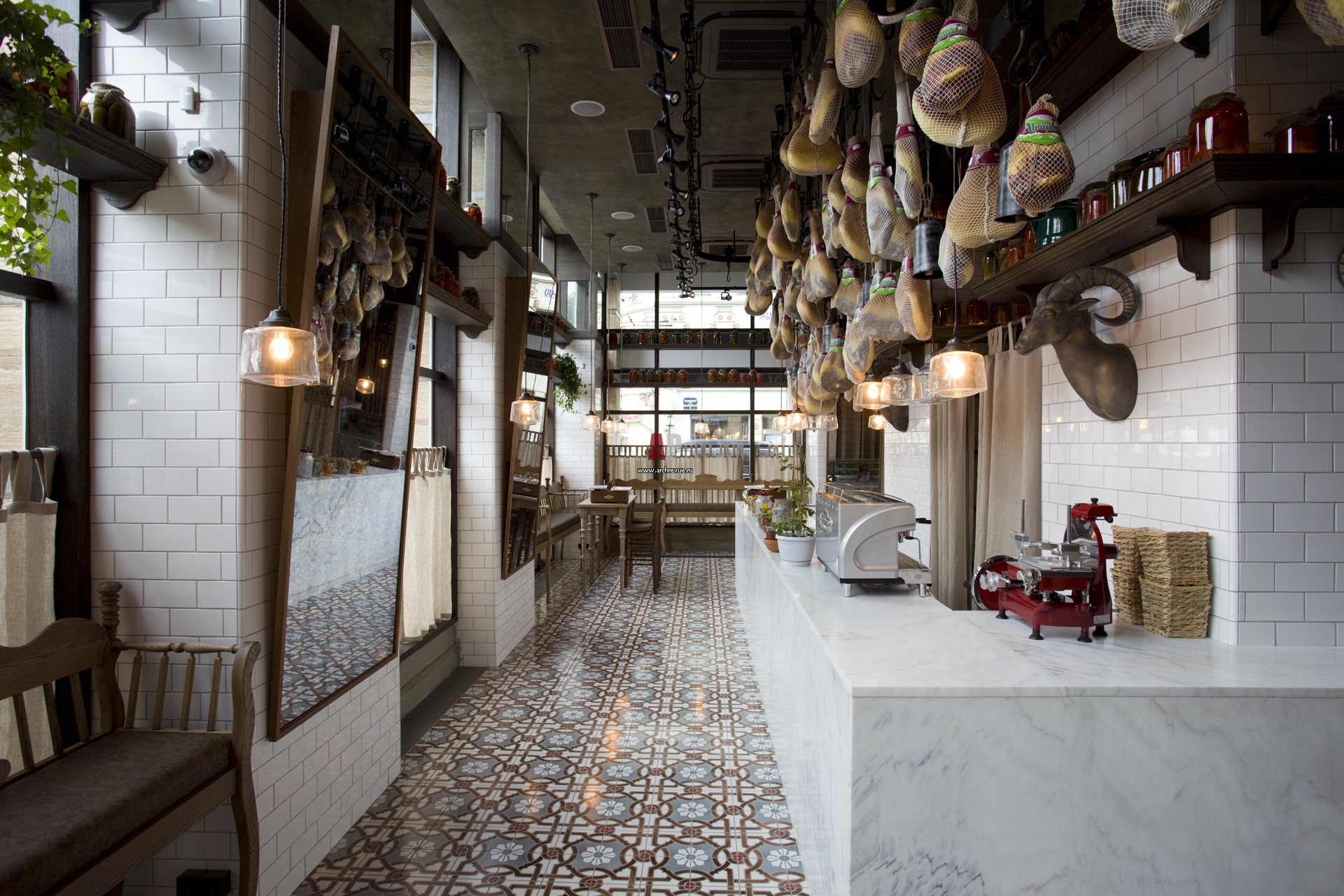 Интерьер зала ресторана. Барная стойка облицована натуральным мрамором серого цвета. На полу – английская глазурованная керамическая плитка с росписью. Стены декорированы однотонной белой плиткой в виде кирпичиков.