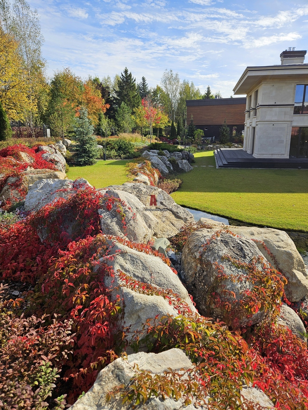 Каменную подпорную стену покрывает виноград девичий, который осенью окрашивается в красный цвет.