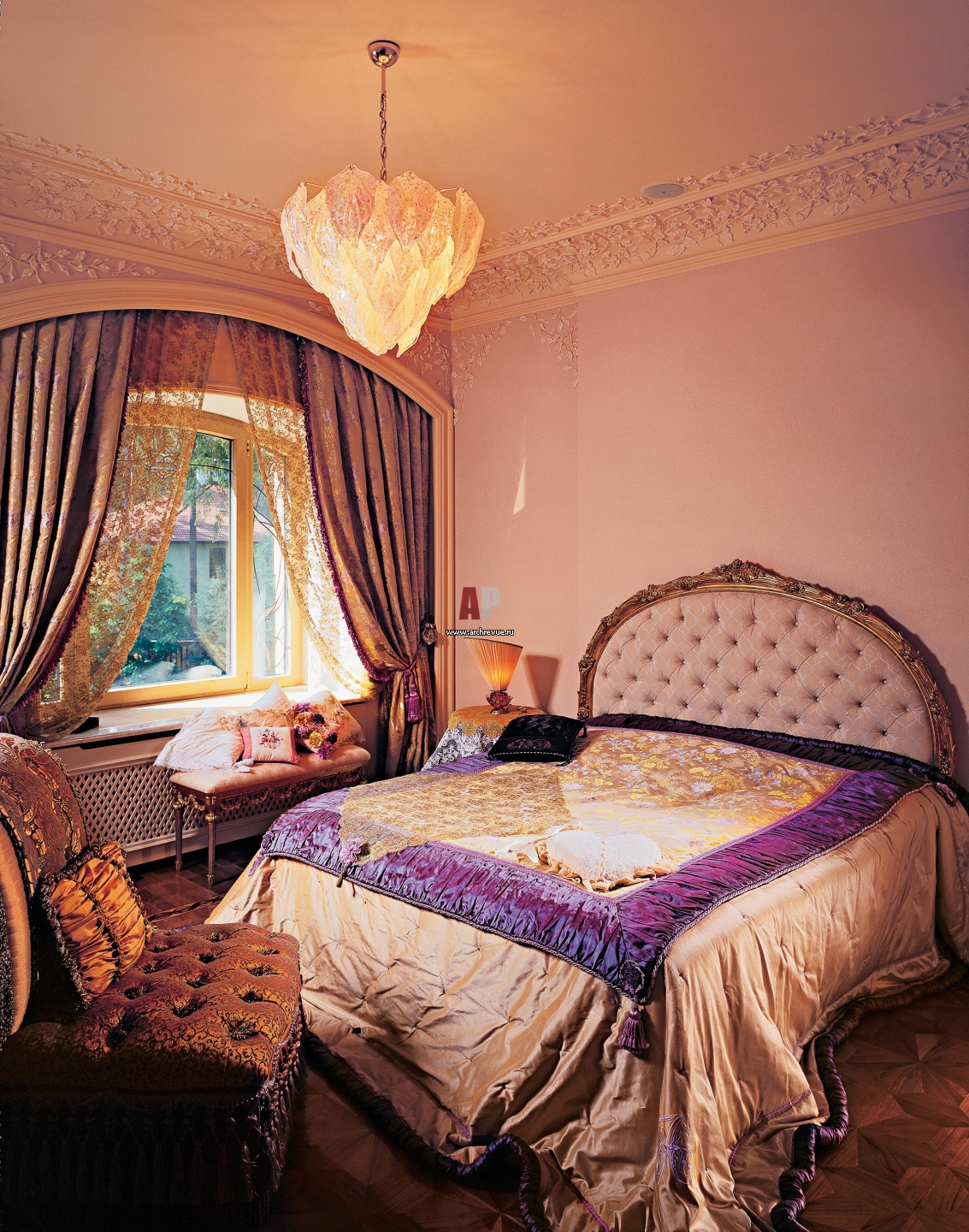 Спальня хозяйки в лиловых тонах. Кровать с обитой шелком полукруглой спинкой, Carpanelli.