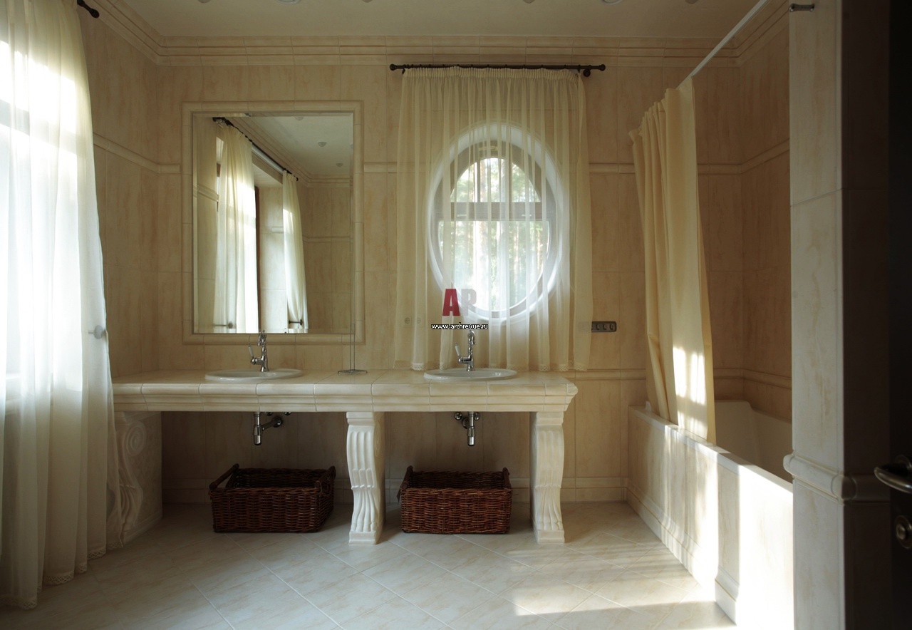 Хозяйская ванная комната облицована плиткой цвета слоновой кости и топленого молока, поставщик «ИКСтайл». Интересная деталь помещения – овальное окно над раковиной. Сантехника Villeroy & Boch.