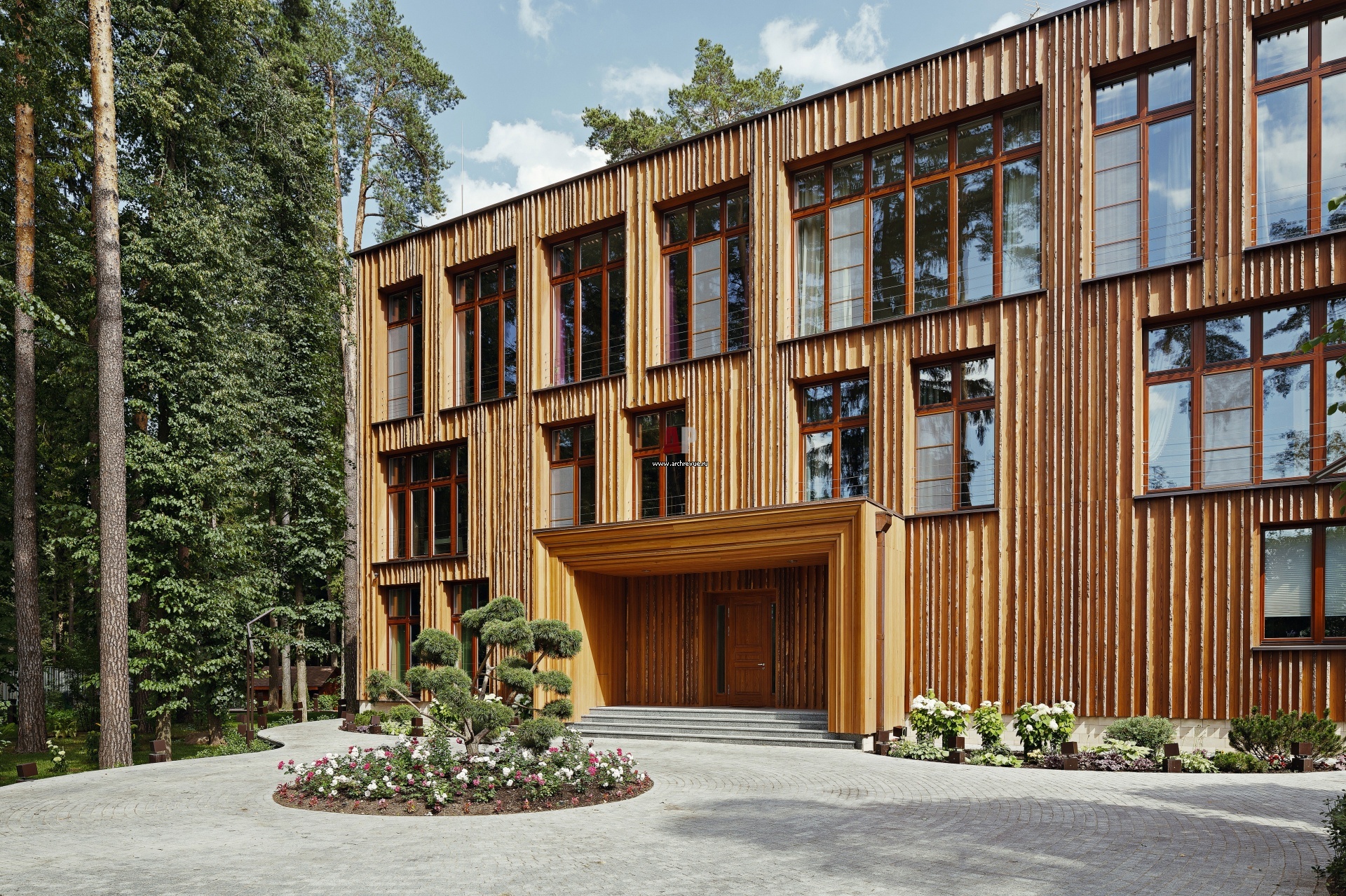 Фасад дома отделан разными по ширине обработанными досками лиственницы, которые перемежаются с досками необрезными, горбылем, они закреплены перпендикулярно плоскости стены. Сложный рисунок выкладывали по месту, чтобы не только правильно обрамить все углы и проемы, но и задать фасадам интересный ритм.
