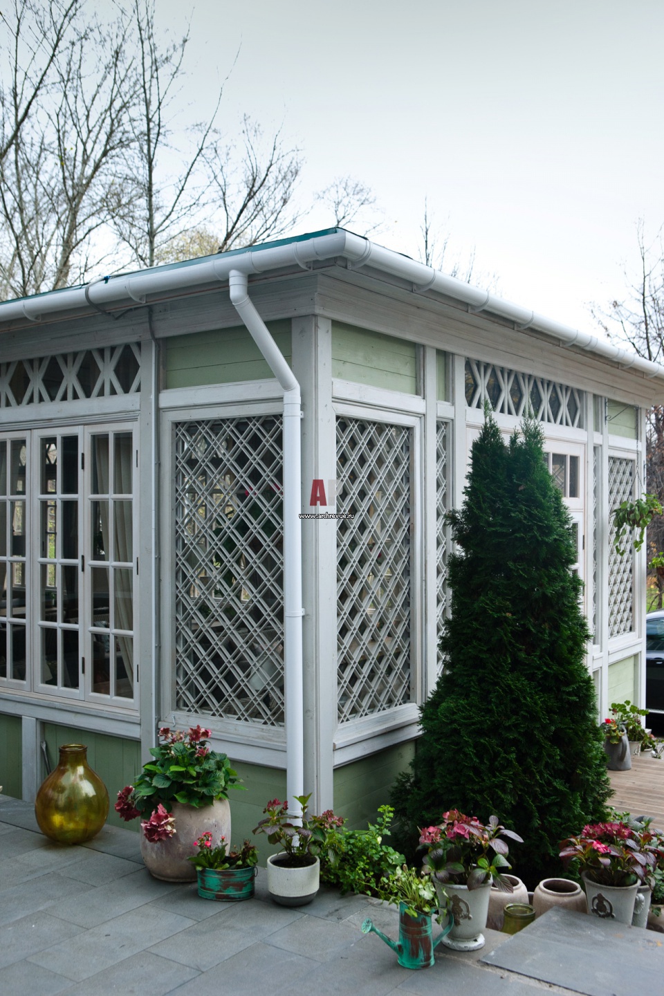 К ресторану примыкает закрытая веранда в дачном стиле. На ступенях – кадки с живыми цветами.