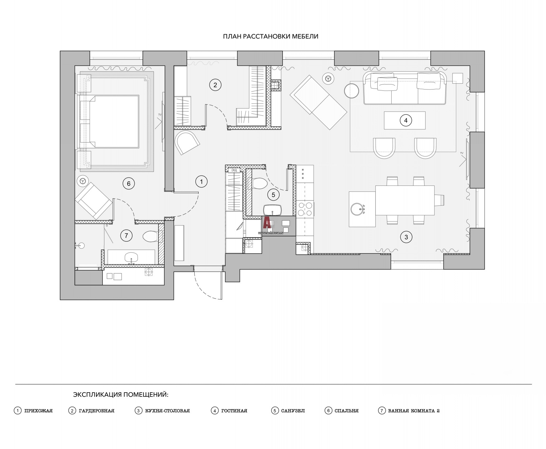 Планировка евродвушки в высотке на Красной Пресне. Общая площадь – 90 кв. м.