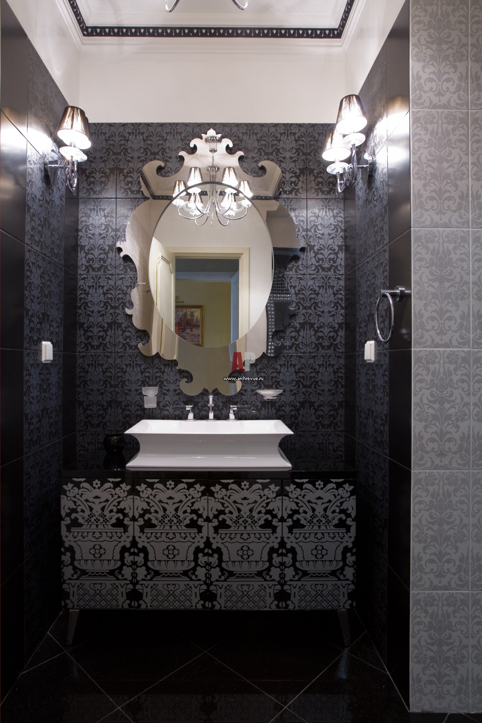 Мужской санузел в строгой черной плитке с барочными узорами.